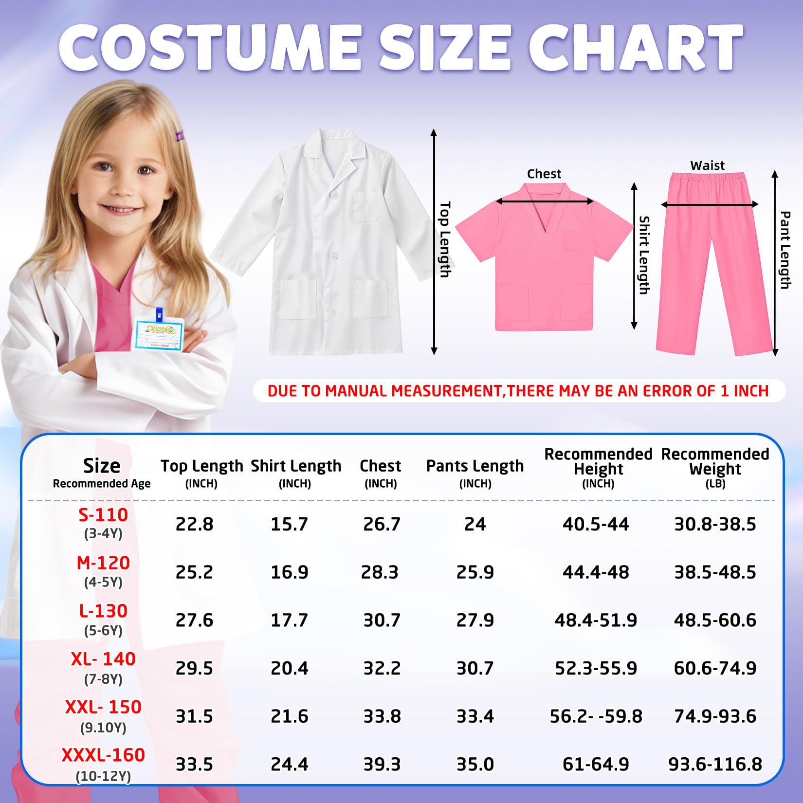 Bring out the scientist in your little one with this fun Doctor Scientist Lab Costume! This standard white lab coat will have them feeling like a real chemist or biologist as they conduct experiments around the house.Made from durable polyester it features all the classic details any aspiring researcher needs including long sleeves a button front breast pocket and loop collar. Whether they dream of discovering the for an illness or unlocking the mysteries of the universe this lab coat transforms them into a scientist for Halloween or pretend play all year round. Doctor Scrubs 7pc set:Coat*1 top*1 trousers*1 cap*1 mask*1 Stethoscope Props*1 Name tag *1 Size:Suitable for children aged 3-11 Years.Please select the right size before purchasing. Material:Polyester65% Cotton35% ;Super Soft Kids Doctor Set.Soft fabric comforable to wear. Real doctor cosplay:V-neck Top Dolman Sleeves Chest Pocket 2pc*Front pocket. Occasion:this costume is great for Doctor cosplay Hospital theme partyLab Halloween Christmas dress-up stage performance role play photo prop Birthday party and costume parties.Playtime Every day and More!