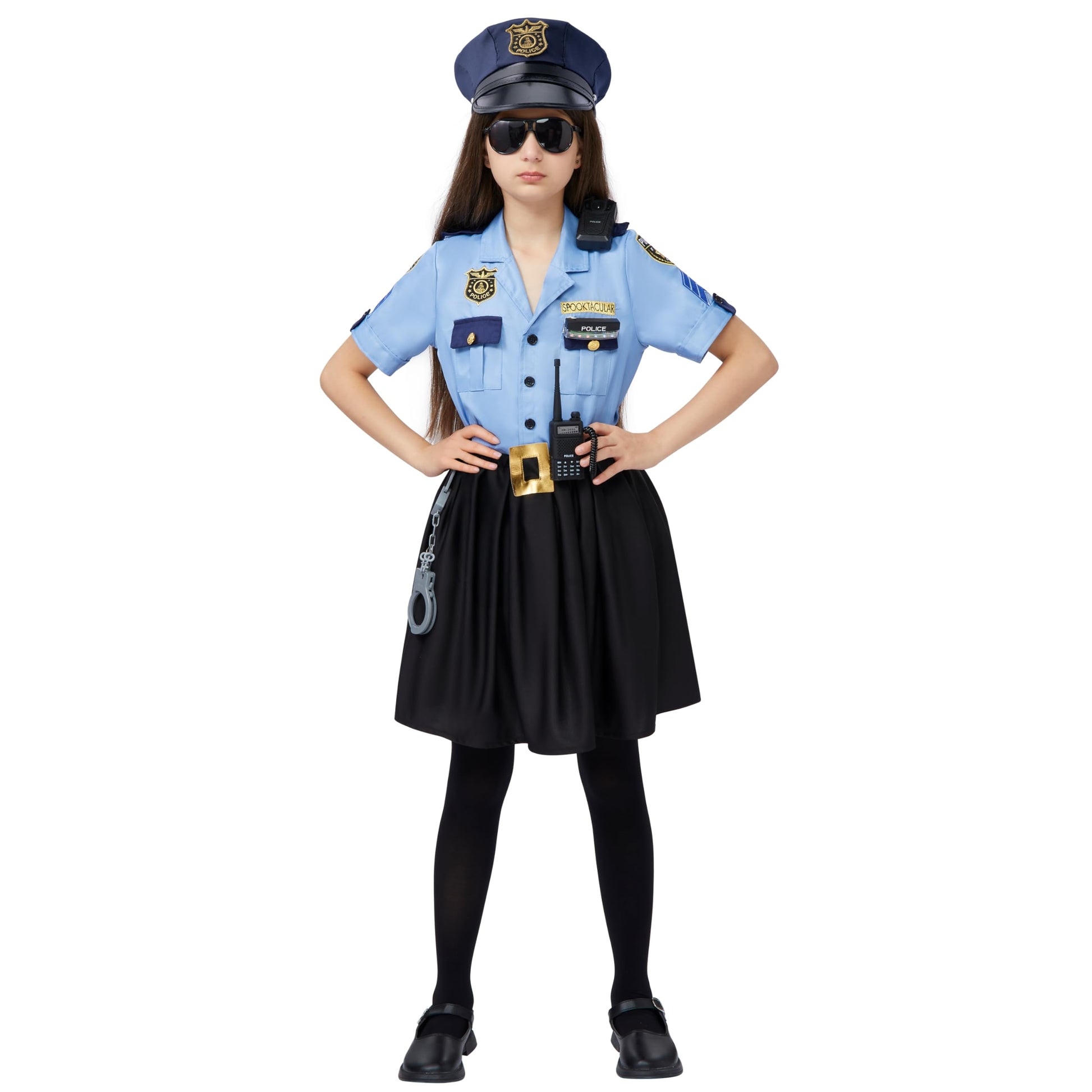 Spooktacular Creations Police Officer Costume for Girls Cop Costume for Kids Role-Playing and Halloween Dress Up-M13 PCS Includes: This police costume for girls set includes 1 top 1 skirt 1 hat 1 pair of handcuffs with keys 1 walkie-talkie toy 1 pair of sunglasses 1 recorder 1 Badge and other 5 cool police toys. The police badge on the top and these gears will make your child feel like a real police officer.enhanced Quality: Made of 100% polyester material it is comfortable to wear no odor non-toxic providing you with peace of mind when it comes to its quality and compliance with safety standardsSpecial Occasions: Ideal for Halloween dress-ups costume parties theme parties stage performances and role play this cop costume is sure to be a hit and perfect for any occasionsCare Instructions: To keep your police outfit clean and fresh we recommend sponge cleaning or hand washing. Do not brighten tumble dry or ironPerfect Fit: Our police dress up costume is designed for children and available in four sizes (Toddler Small Medium and Large) which is suitable for kids of different ages and ensures a great fit