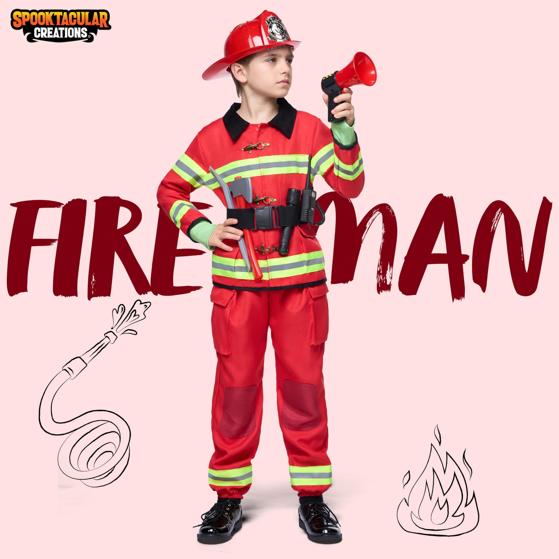 Spooktacular Creations Halloween Boys Fireman Costume Firefighter Costume for Kids Red Toddler Fireman Jumpsuit Accessories Set for Dress-up and Roleplay Party (Large 10-12 yrs)