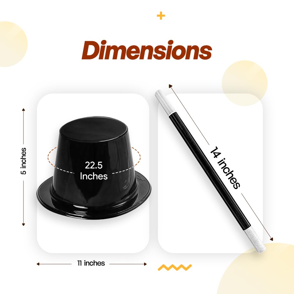 Magician hat inner circumference measures 22.5 inches, magician wand is 14 inches. Hats are one size fits most teens/adults. Hats and wands are made of sturdy hard plastic. This package is great for birthday parties, family get together, magic shows, or playtime.