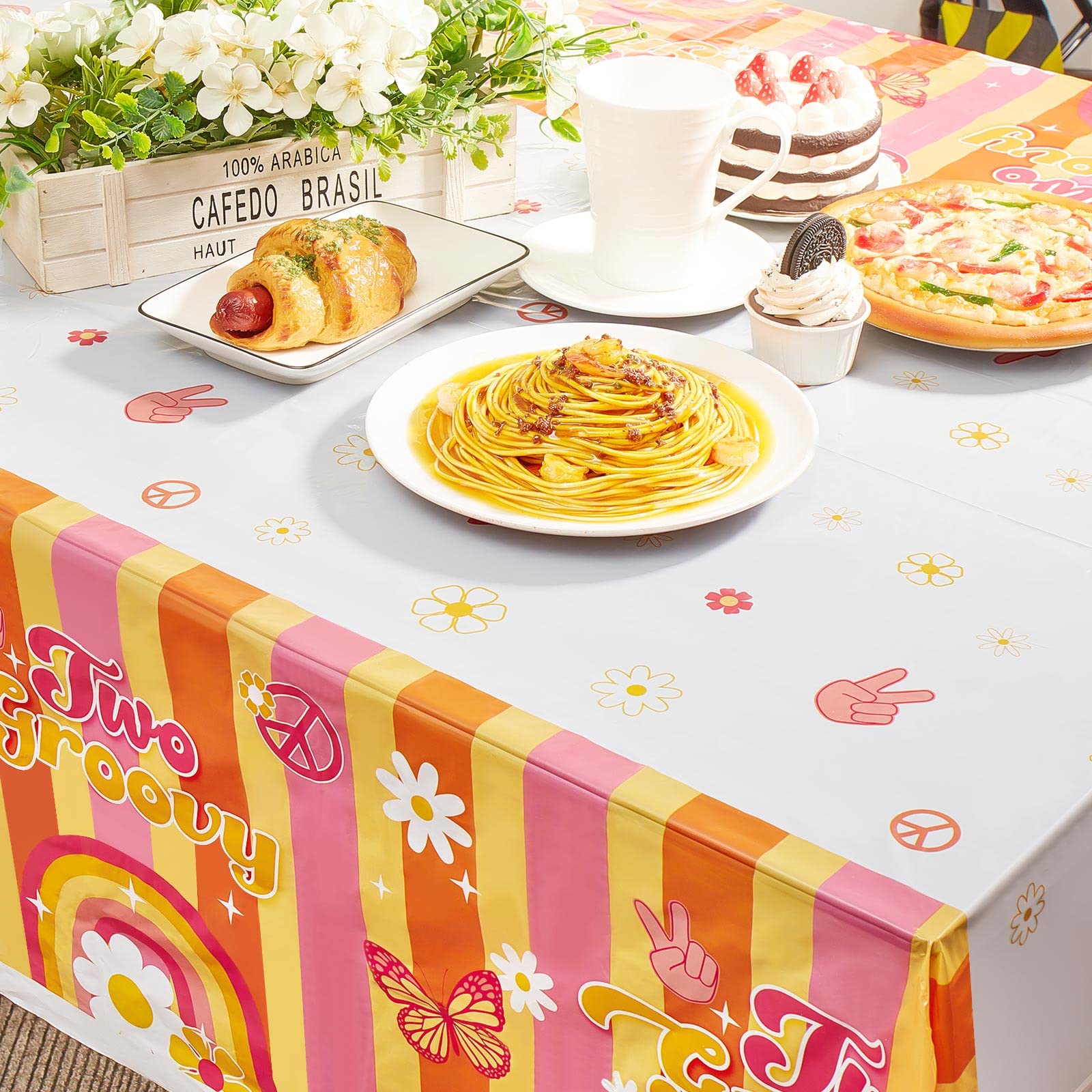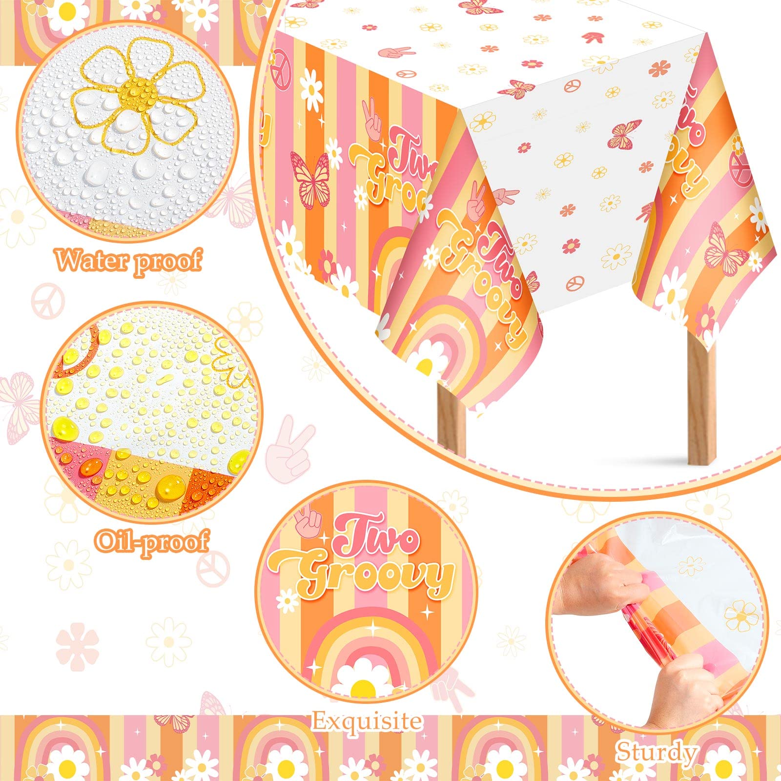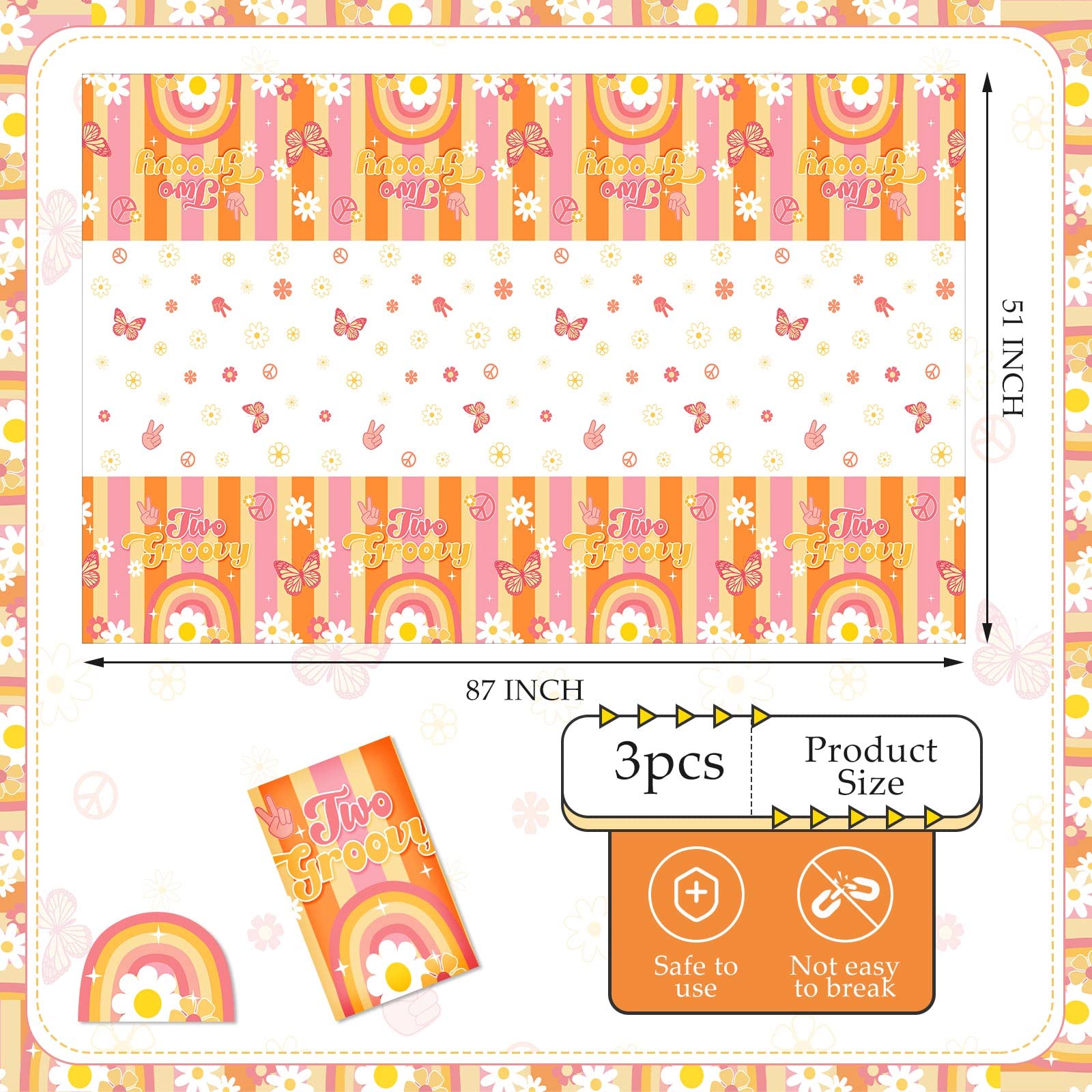 Jecery 3 Pcs Rainbow Plastic Two Groovy Tablecloths Retro Hippie Boho Party Table Covers Disposable Daisy Flower Groovy Party De