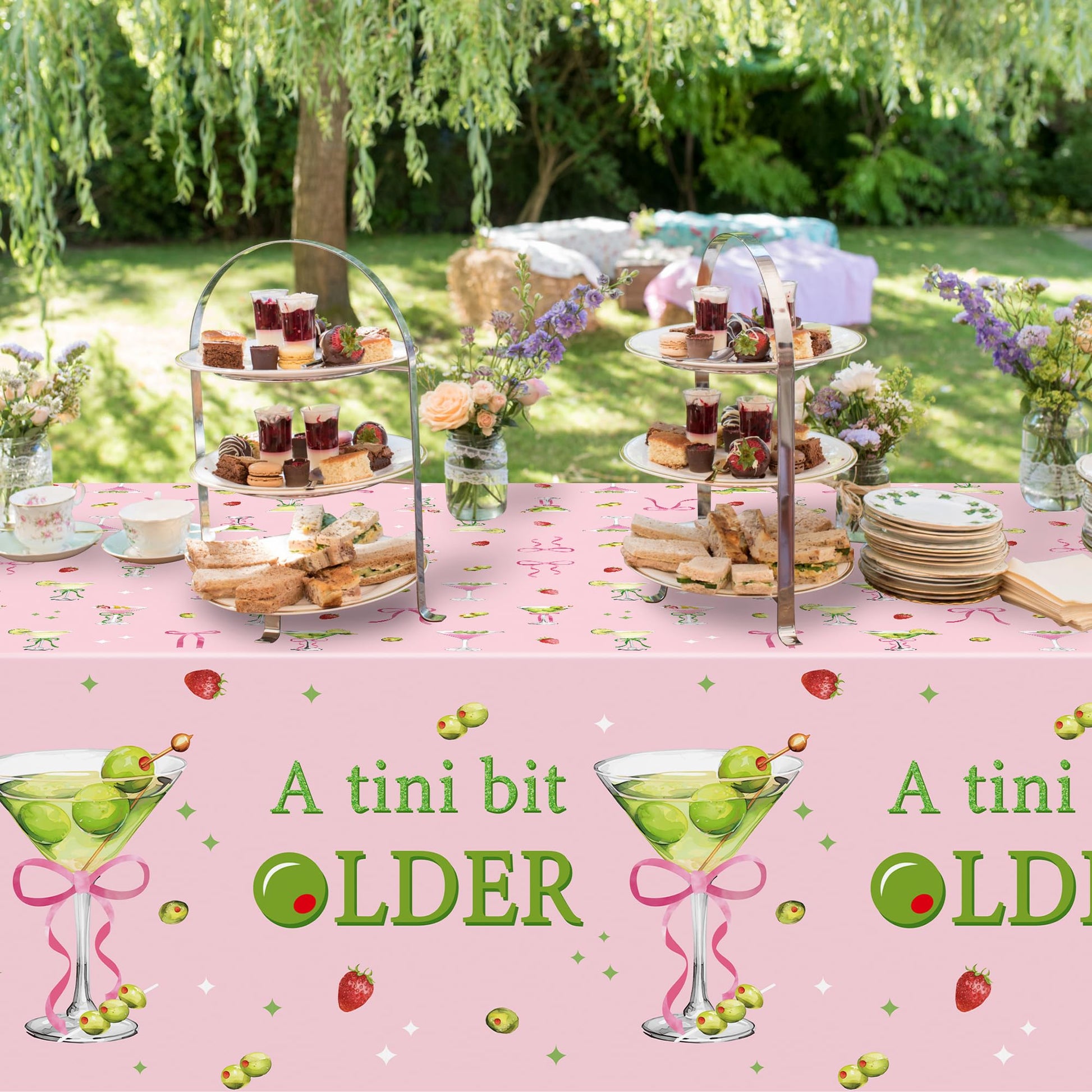 Pink Green Martini Party Tablecloths - 3Pcs A Tini Bit Older Birthday Table Covers, Martini Bow Themed Party Decoration Plastic