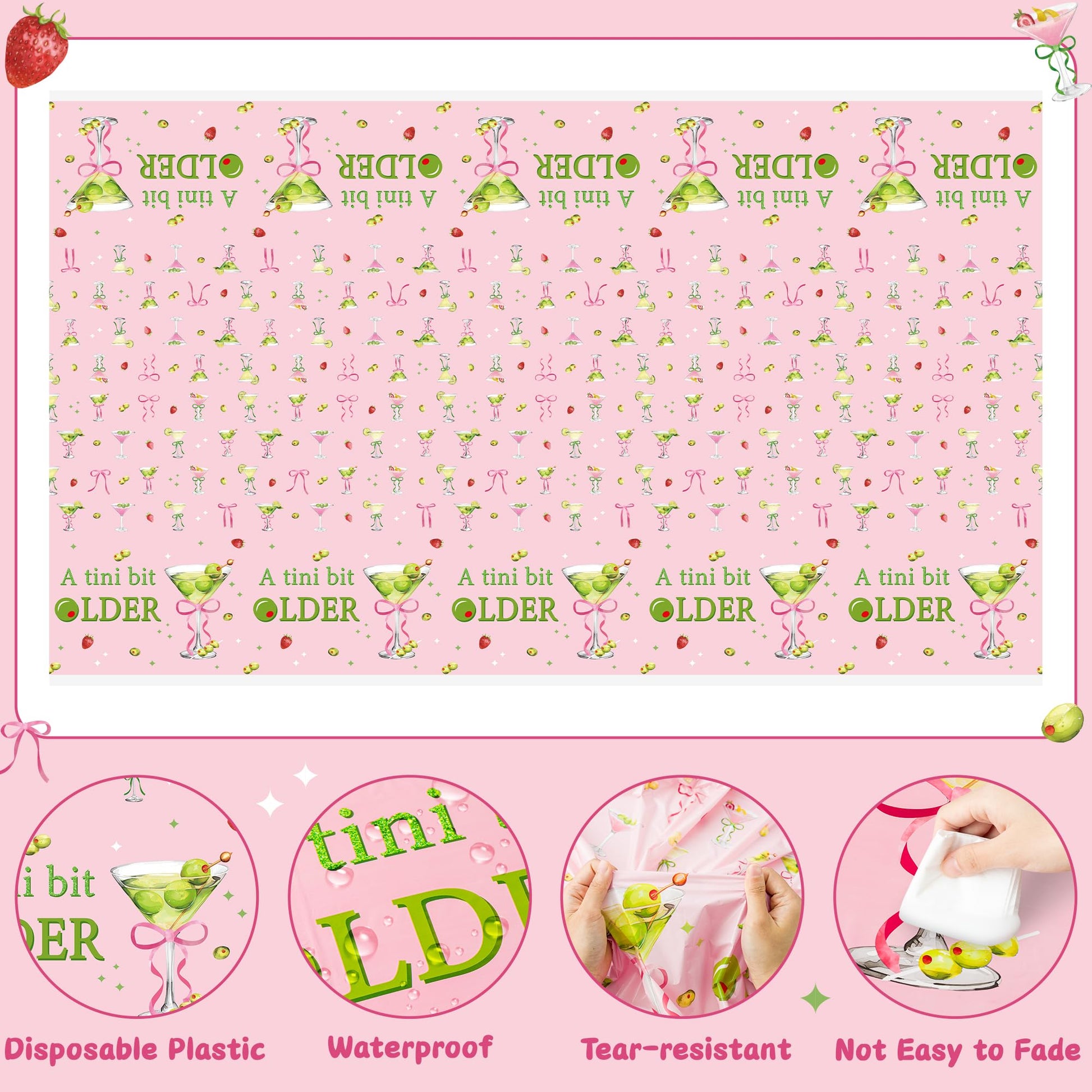 3Pcs Pink Green Martini Party Tablecloths A Tini Bit Older Birthday Table Covers Party Decoration for Birthday Bachelorette Package Includes: Martini bow tablecloths x 3 Product Size: 108 x 54 inches / 274 x 137 cm Product Material: PE Tips: Due to the printing process, you may smell a plastic odor when you first open the package. This odor is harmless and it is recommended that you open the tabletop completely and place it outside or in a spacious isolated area with good air circulation to allow the odor to dissipate.
