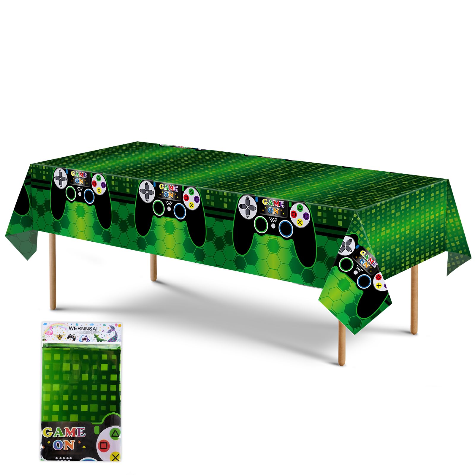 - Q: What themes do the WERNNSAI Video Game Table Covers feature? A: The table covers feature a green and black technology theme, making them an excellent choice for gamer parties and geek-themed celebrations.