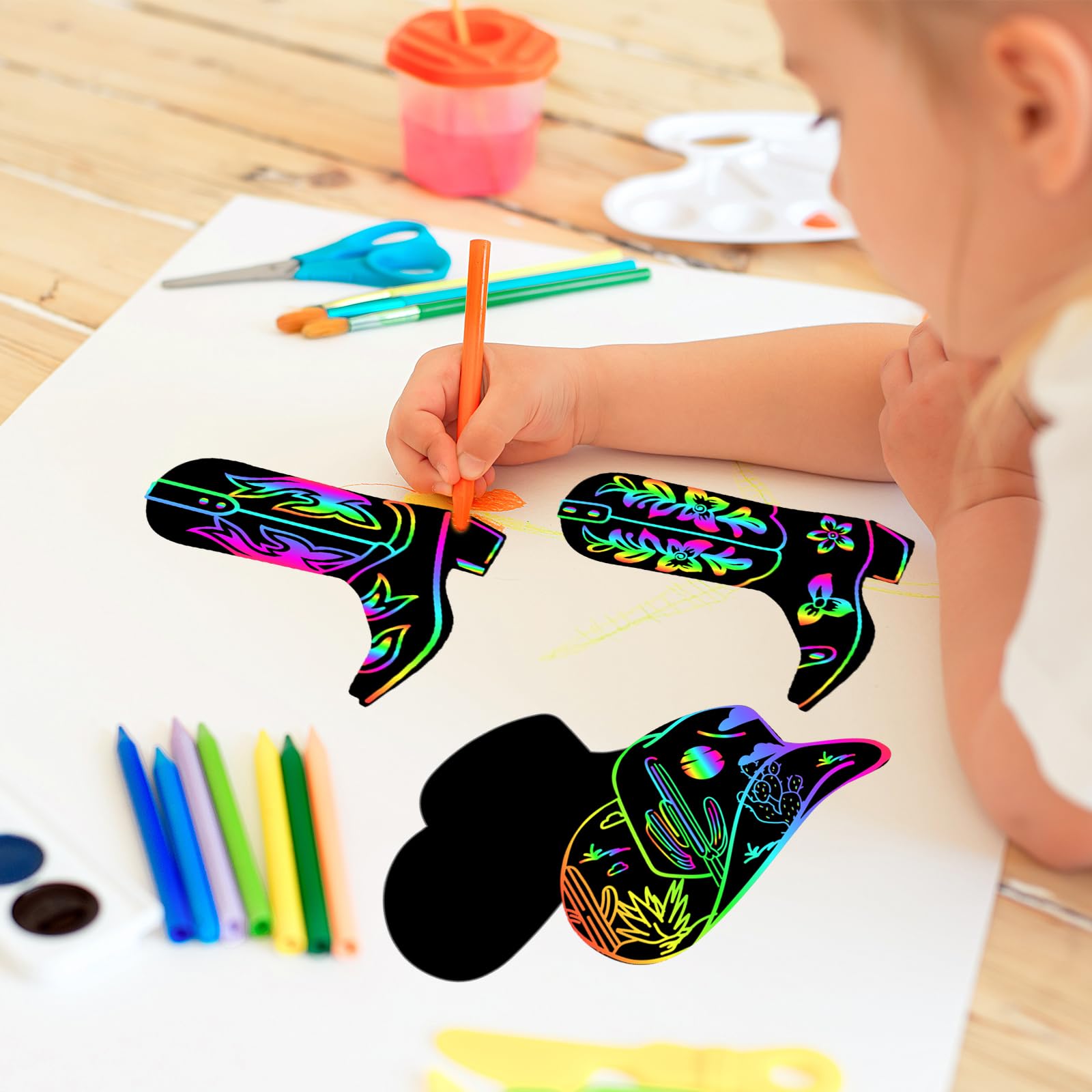 Features: Complete Set: Our scratch paper featuring western cowboy theme, shaped in cowboy hat and cowboy boot, will make you enjoy more creative freedom, variety and possibilities. Practical Supplies: Scratch paper kits make a good gift for friends and family, a creative decoration for western cowboy party, an interesting drawing activity for classroom and family entertainment. Specifications: Material: cardstock, wood, ribbon Size: shown in the pictures Color: black Package includes: 60 x Scratch Paper 30 x Wooden Stylus 60 x Ribbon