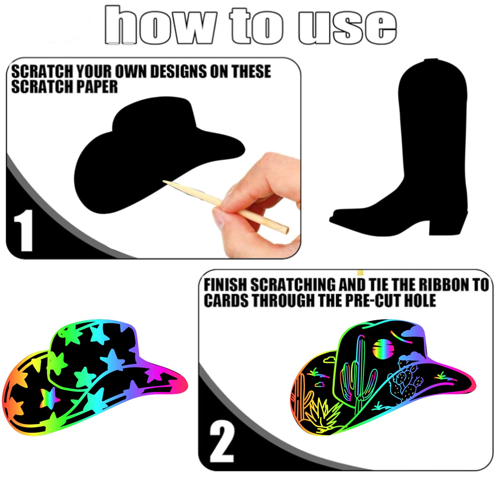 JarThenaAMCS 60 Pcs Western Cowboy Scratch Paper Craft Kits Cowboy Hat Boot Scratch Cards Ornaments with Ribbon & Wood Styluses