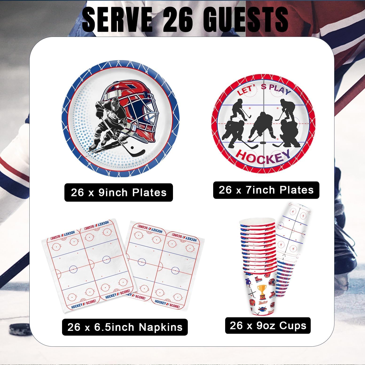 104 PCS Hockey Party Table Supplies Kit Serve 26, Includes Dinner Plates, Dessert Plates, Napkins, Cups for Ice Hockey Birthday