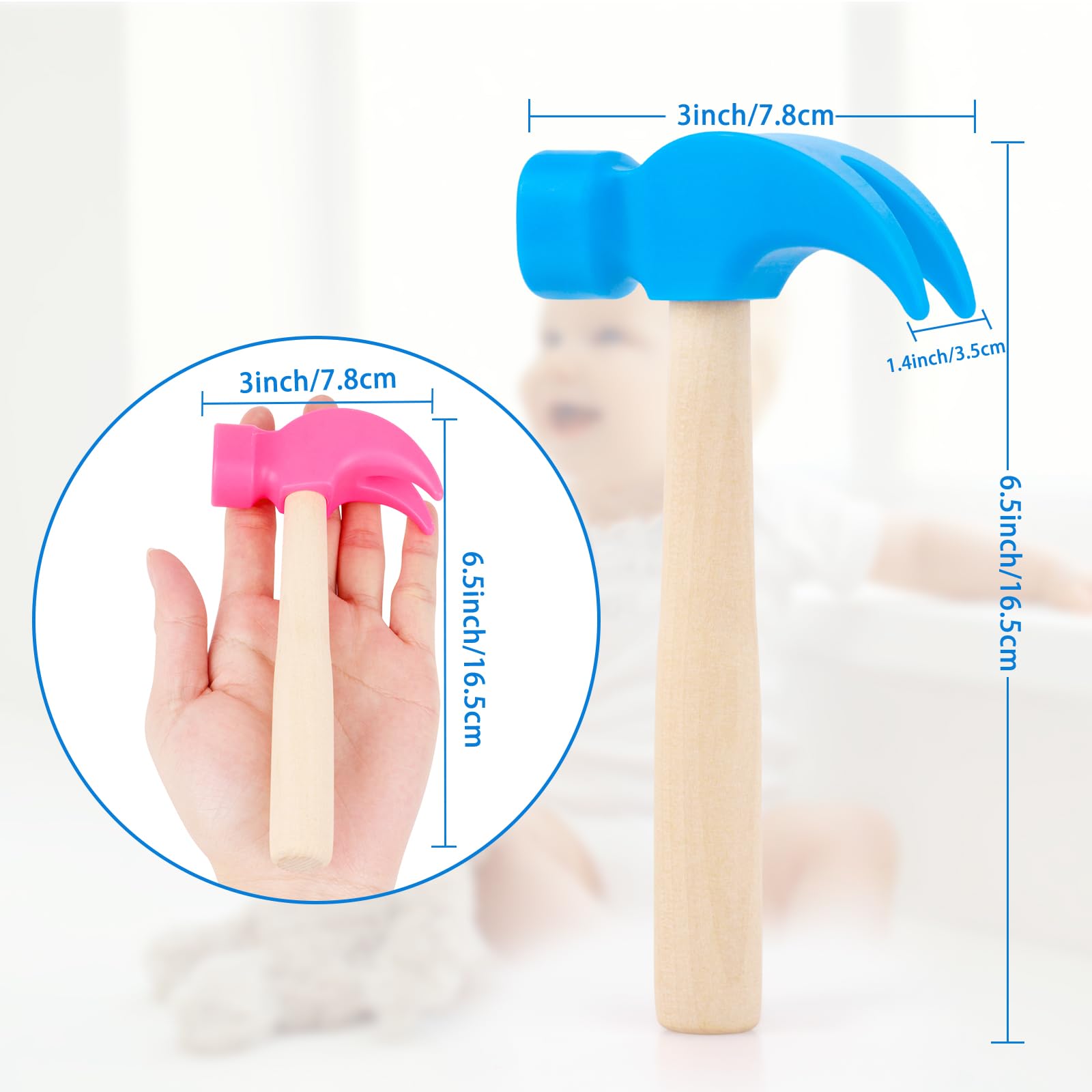 The package includes 1pcs blue wooden hammer toy and 1pcs rose red wooden hammer toy, each wooden hammer size is 6.5 x 3 inch, comact size and lightweight, suitable for kids to play and convenient to carry.