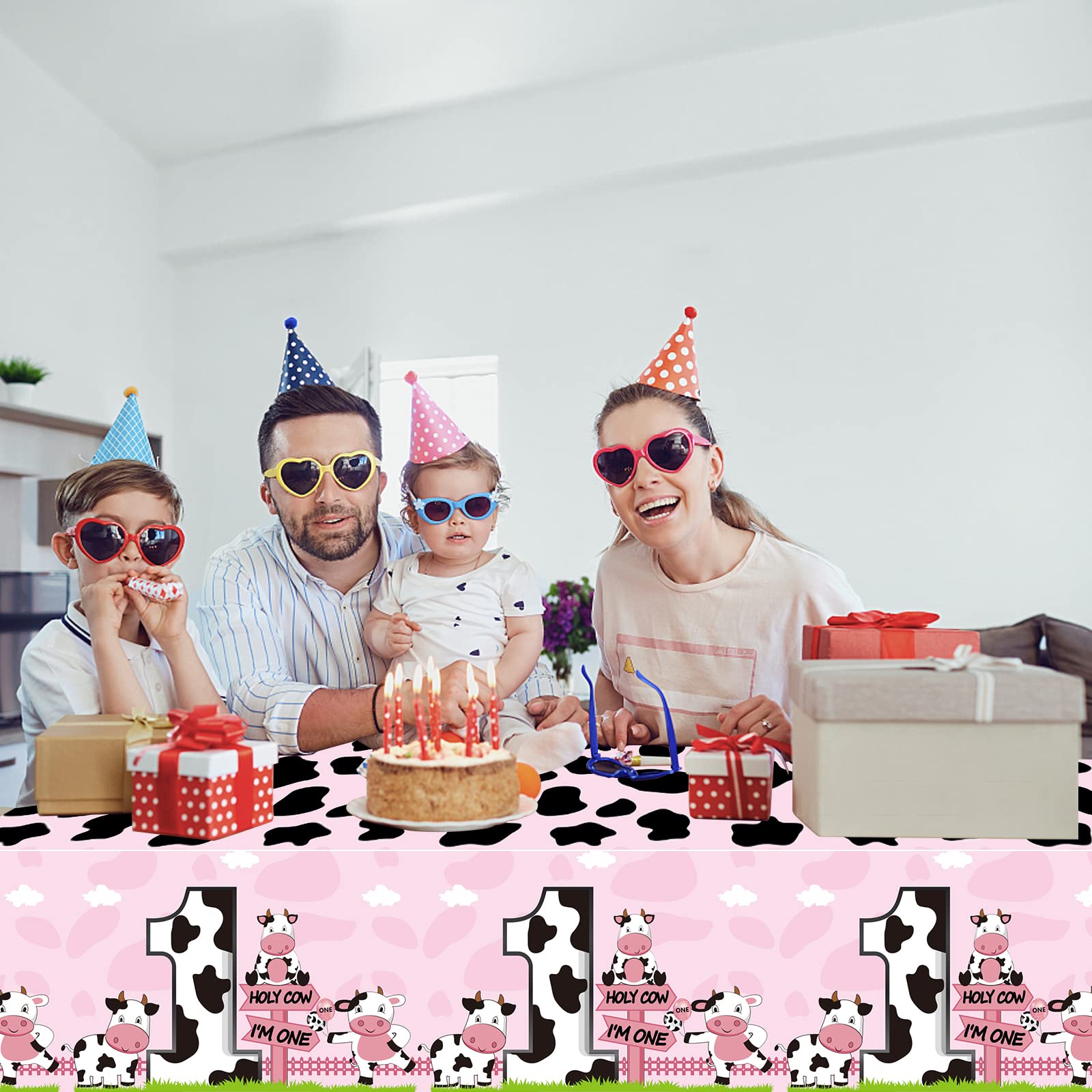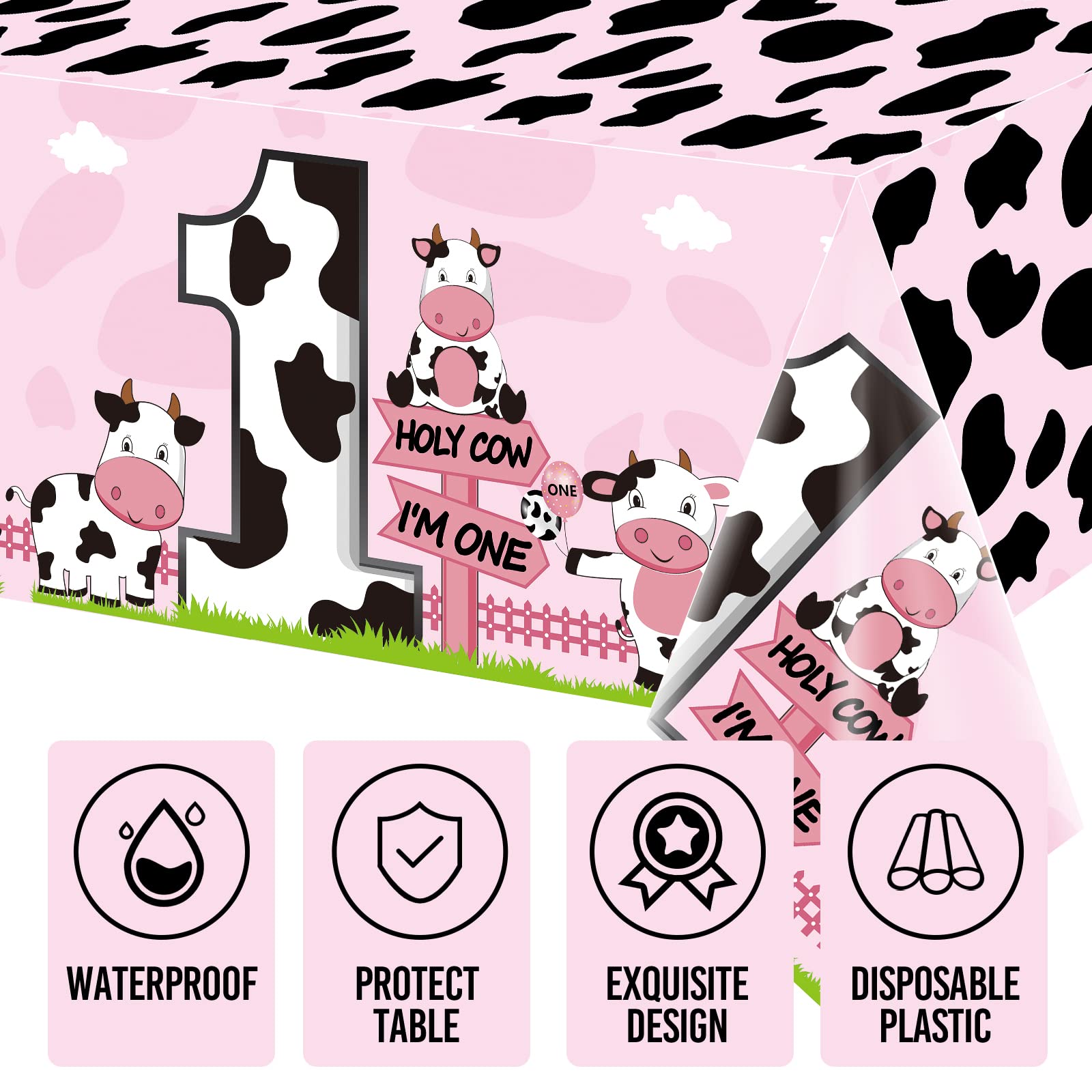 3packs of Holy Cow Im One Birthday Tablecloth Decorations Material: Plastic, durable and thick Size: 54 x 108 inches Color: pink Easy to use: Just unfold and put on the table to use. Easy to care, easy to clean with a cloth, reusable. Package: 3 x cow print first birthday tablecloth