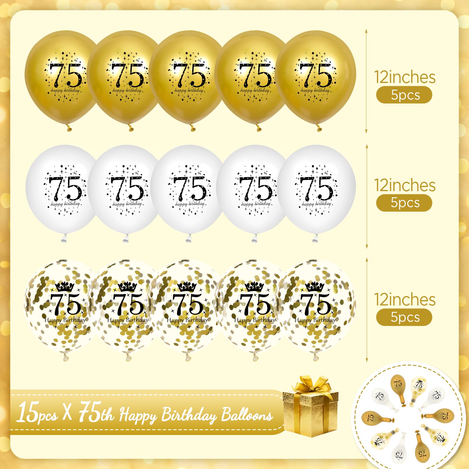 - Q: What is included in the 75th Birthday Balloons pack? A: The 75th Birthday Balloons pack includes 15 pieces of 12-inch latex balloons, comprising 5 metallic gold balloons, 5 white balloons, and 5 confetti balloons, perfect for celebrating a 75th birthday.