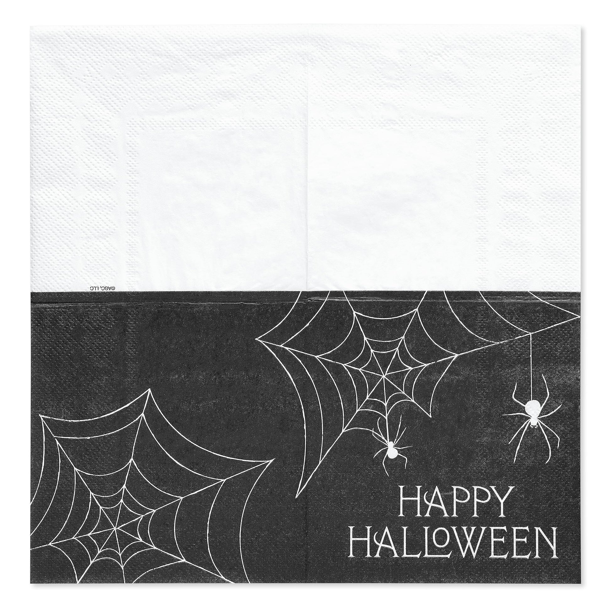 - Q: What designs are featured on the napkins? A: The napkins feature ghostly white spiderwebs with dangling spiders on a dramatic black background, adding a spooky touch to your party decor.