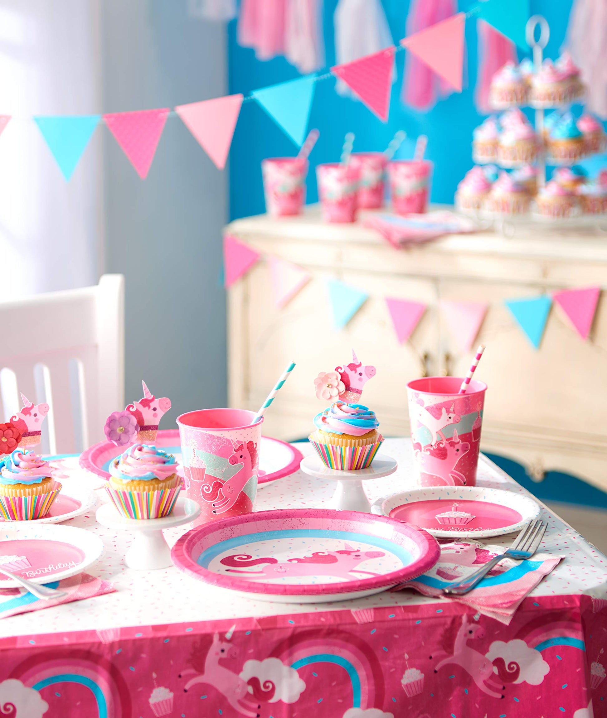 Give your celebration a touch of whimsy with the Rainbow Unicorn Birthday Party Banner Kit from American Greetings. This easy-to-assemble 7-piece kit features pink and blue unicorn characters and includes an 8.5 foot “Happy Birthday” banner, 3 swirl decorations with 5-inch cutouts, and 3 swirl decorations. Perfectly unique for your perfectly unique party and party-goers! Only from American Greetings.