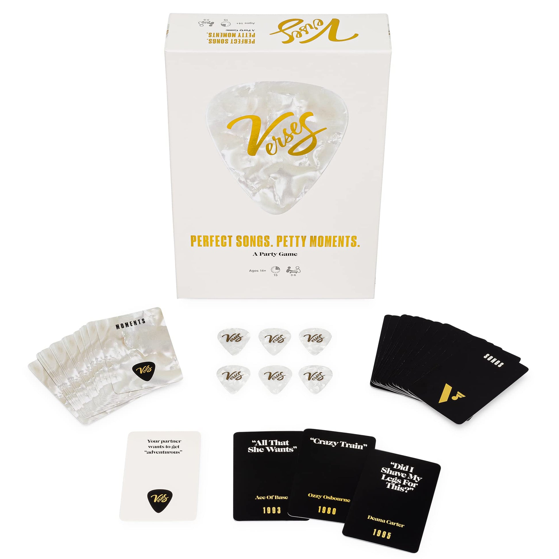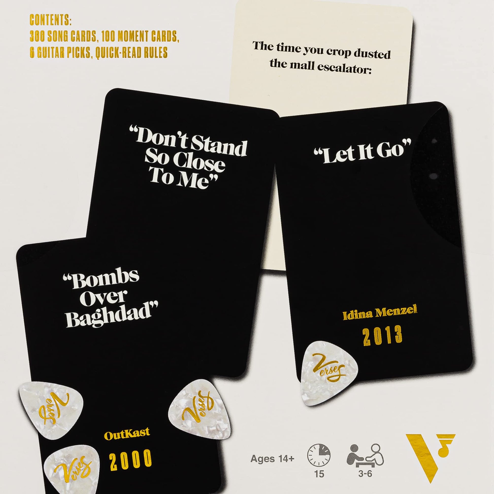 Life Is Full Of Moments. Wild, Rude, Or Downright Cringe. Verses Is The Head Nodding Party Game That Gives These Moments A Beat! Players Match Moment Cards With Song Cards - Featuring The Biggest Pop Bangers From The Past Few Decades - Hoping Their Choice Is Voted The Funniest. It'S The Party Game That Slaps! Verses...Perfect Songs. Petty Moments. This Quick Playing Party Game Is Ideal For Ages 14 And Up And Takes About 15 To 20 Minutes To Play. The Game Is Perfect For 3 To 6 Players. Contents: 300 Song Cards, 100 Moment Cards, 6 Guitar Picks, Temporary Tattoo, Quick-Read Rules