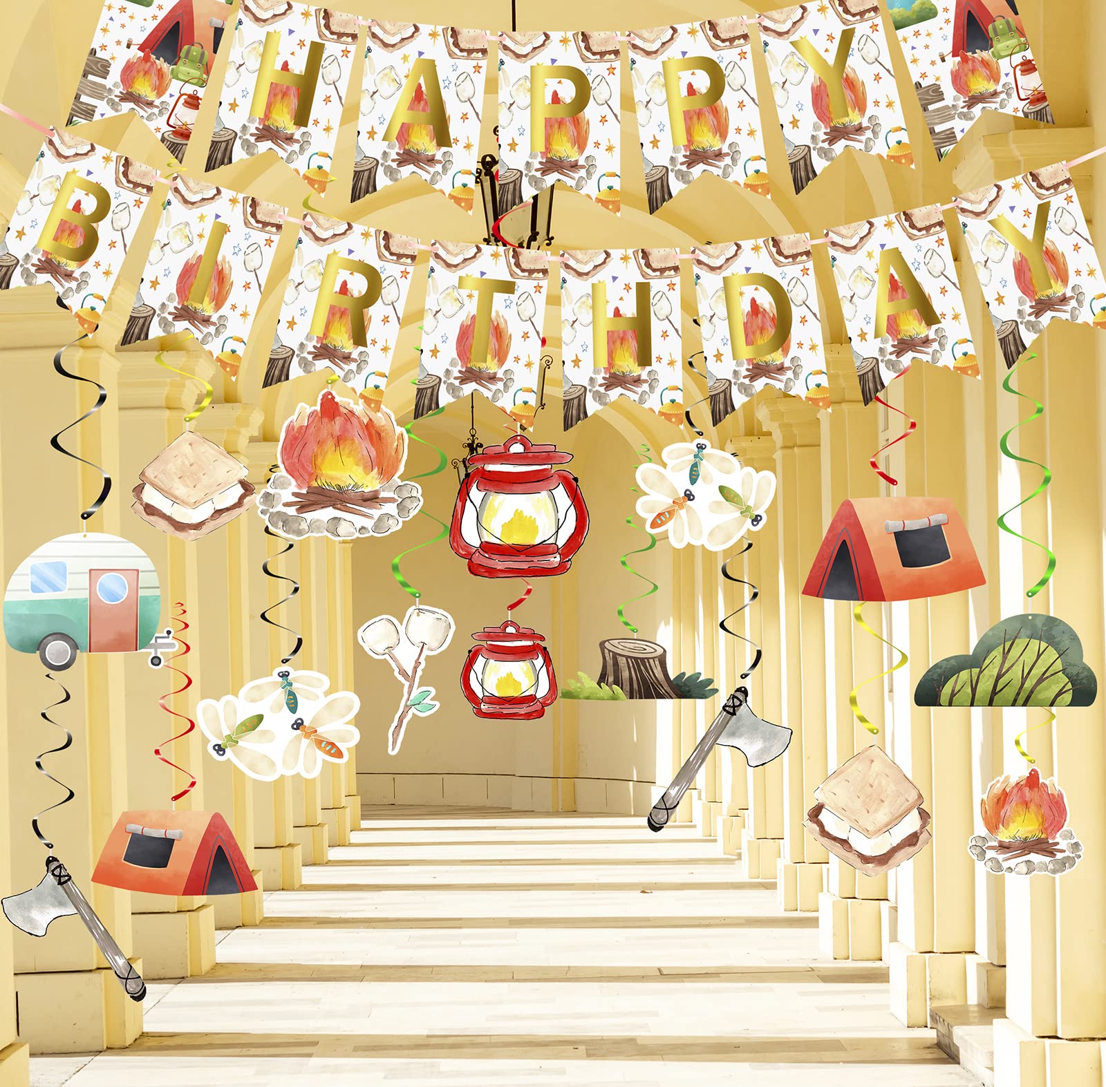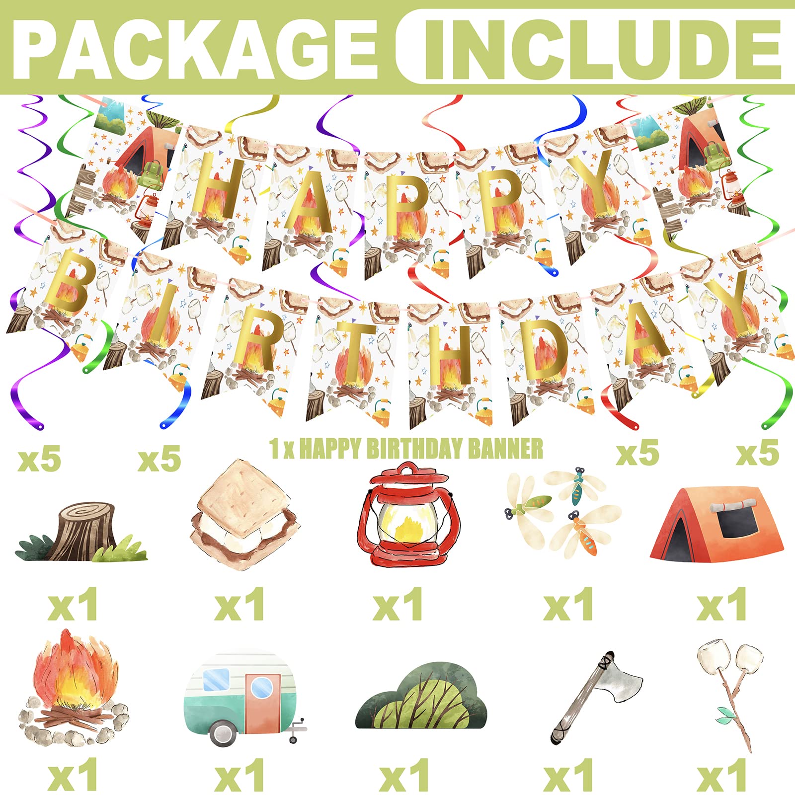 - Q: What items are included in the BonBeeDesign Camping Party Supplies? A: The BonBeeDesign Camping Party Supplies package includes a camping happy birthday banner and 10 foil hanging swirls, designed to enhance your camping-themed celebration.