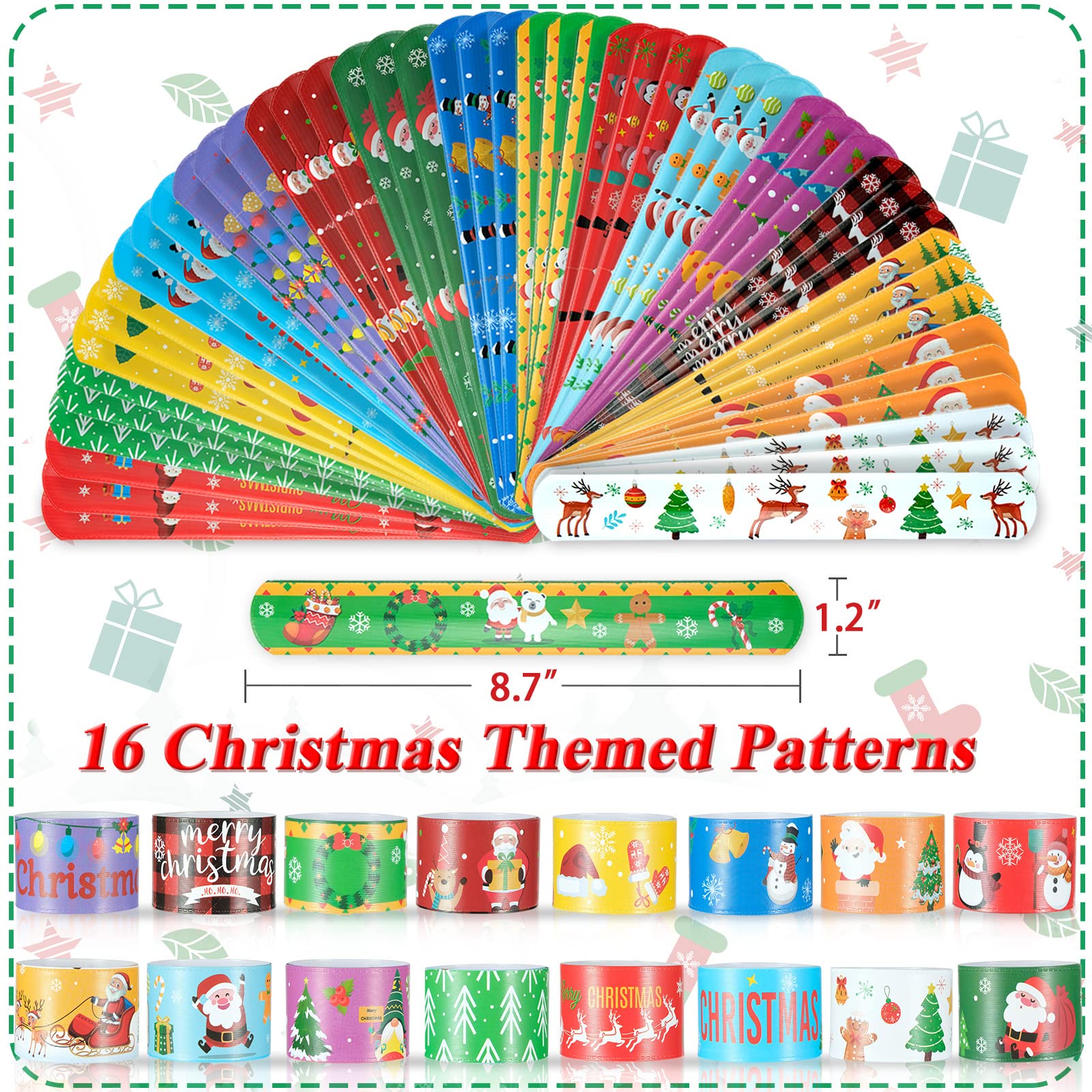 - Q: How many different designs do the Christmas slap bracelets include? A: This set includes 48 slap bracelets featuring 16 different designs, each with a variety of colorful Christmas themes such as Santa Claus, Christmas trees, gnomes, and snowmen.