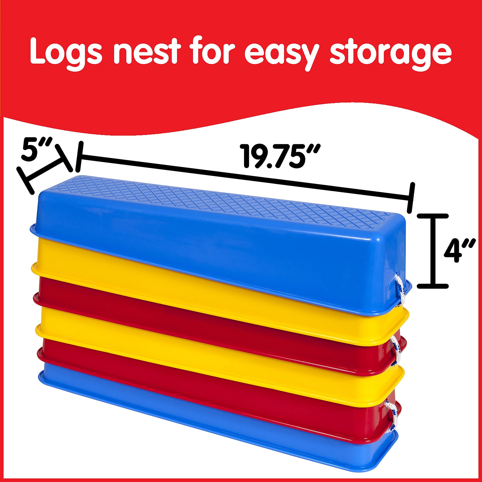 Six brightly colored, sturdy logs are connected with nylon rope in this fun and useful tool for building balance. Each log has been load tested to support up to 400 lb. Two ramps enable easy access for children to walk one foot in front of the other on these balance platforms. Each log has a ribbed top platform to help prevent slipping. The nylon rope in between the logs may be adjusted to different lengths and degrees of difficulty. Made from strong polypropylene, these logs will last when used both indoors and outdoors. Each log platform measures 19.75'L x 5.5'W x 4'H. Total length with rope extended measures 14.5 ft. The improved coordination balance and movement patterns your child experiences with Step-a-Logs will help them to gain confidence and a wonderful sense of achievement. For ages 3+.