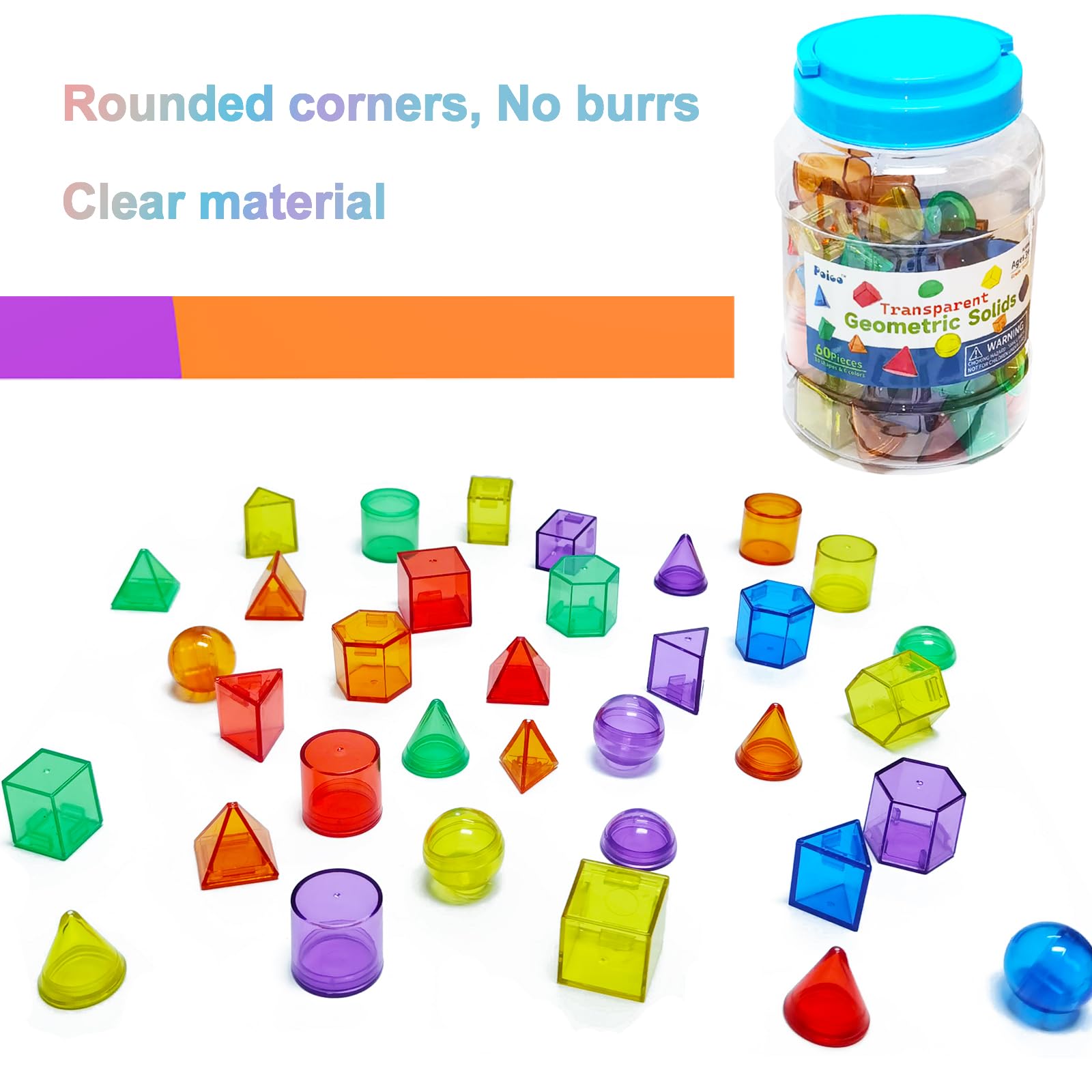 Exbepe 3D Geometric Solids 60 Pcs For Kids Translucent Geometric Shapes For Geometry Beginnings,Light Table Manipulatives Toy Math Helper School Supplies