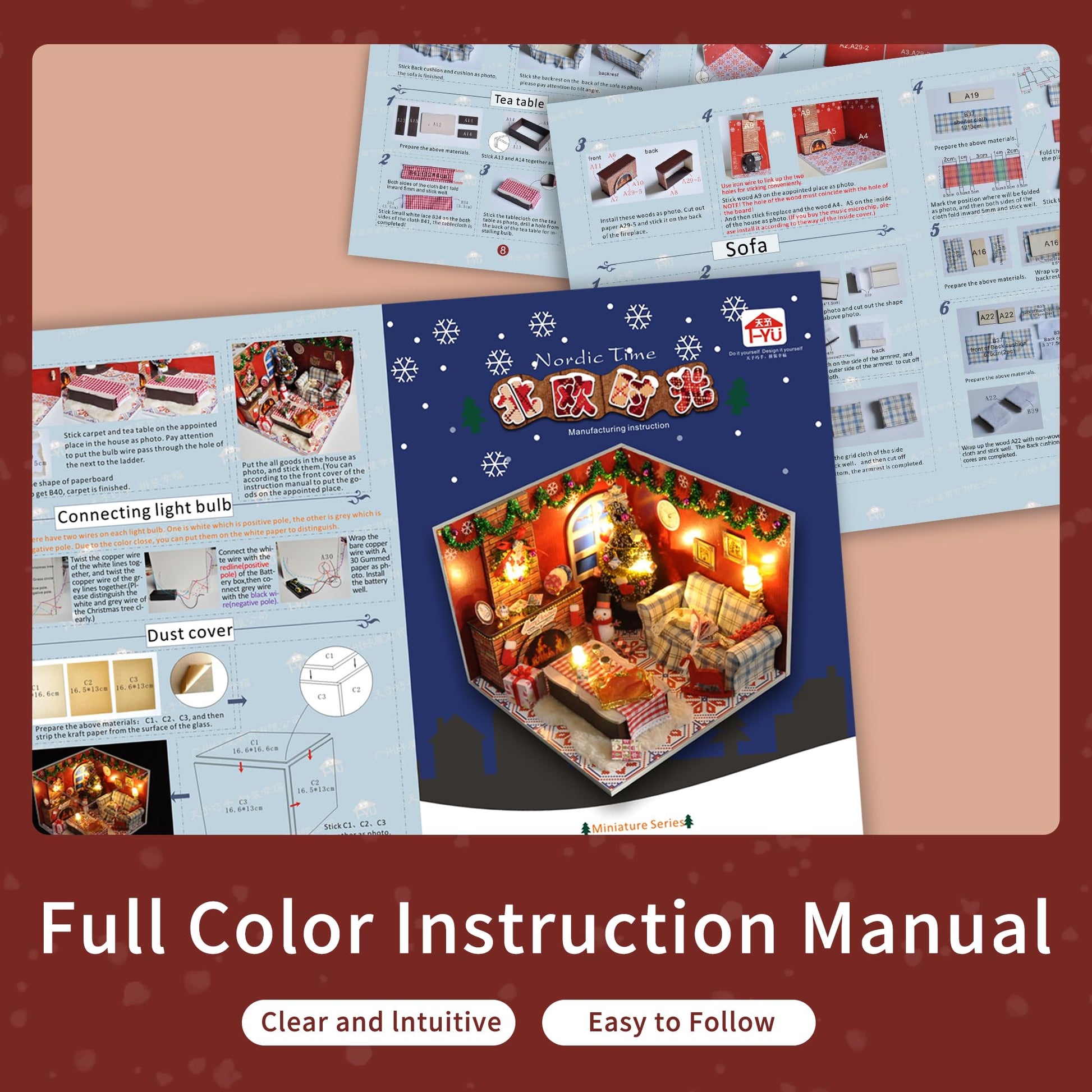 - Q: Does the kit include all necessary furniture and accessories? A: Yes, the kit includes all the furniture and accessories depicted in the pictures, along with a dust-proof cover and a music box that plays a Merry Christmas tune.