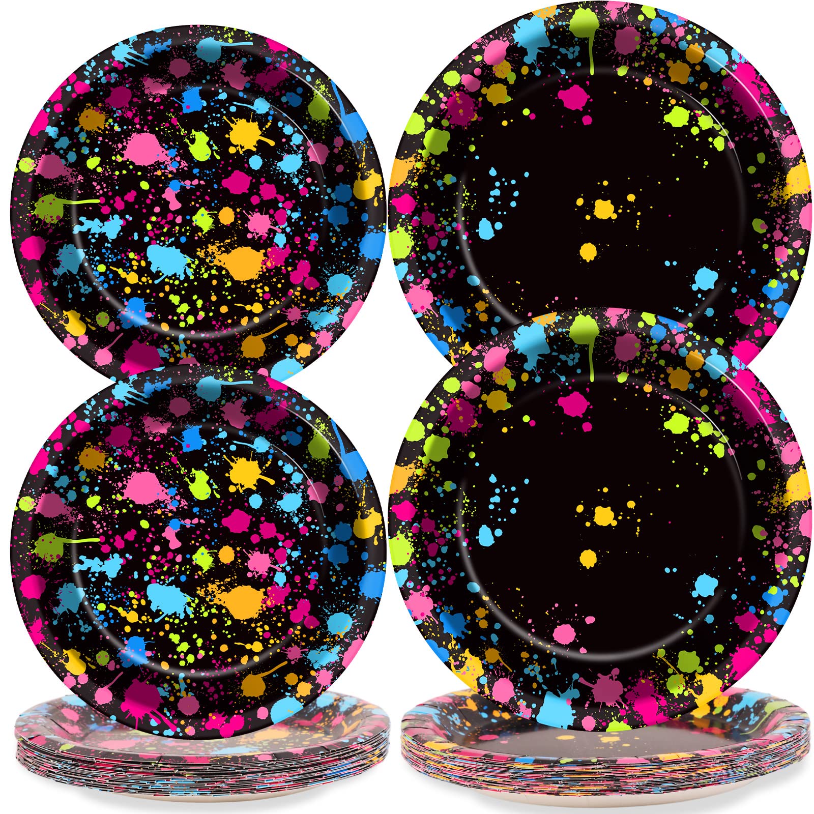 - Q: Do these plates glow in the dark? A: Yes, the neon plates feature a glow-in-the-dark design, adding a vibrant and festive atmosphere to your neon-themed birthday party.