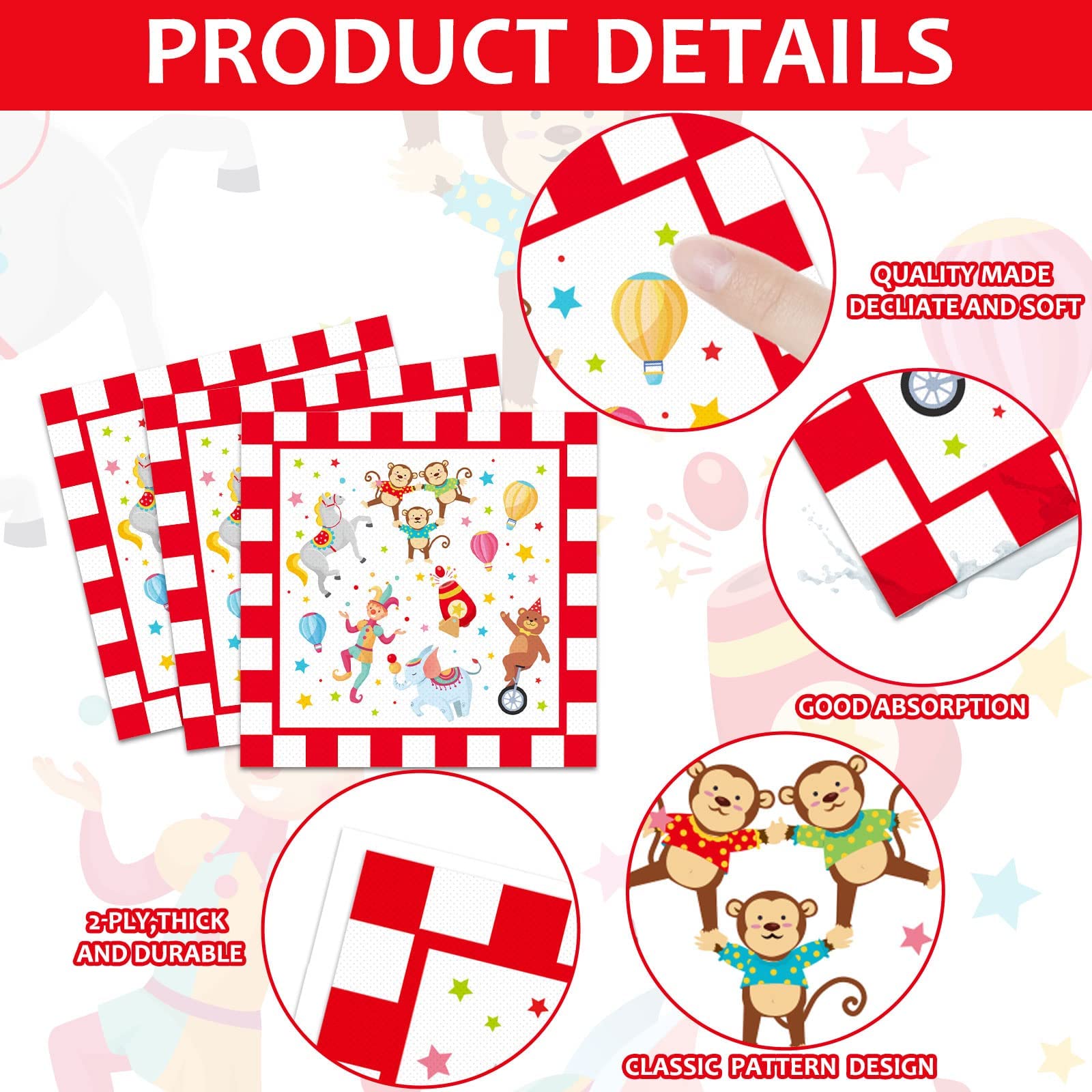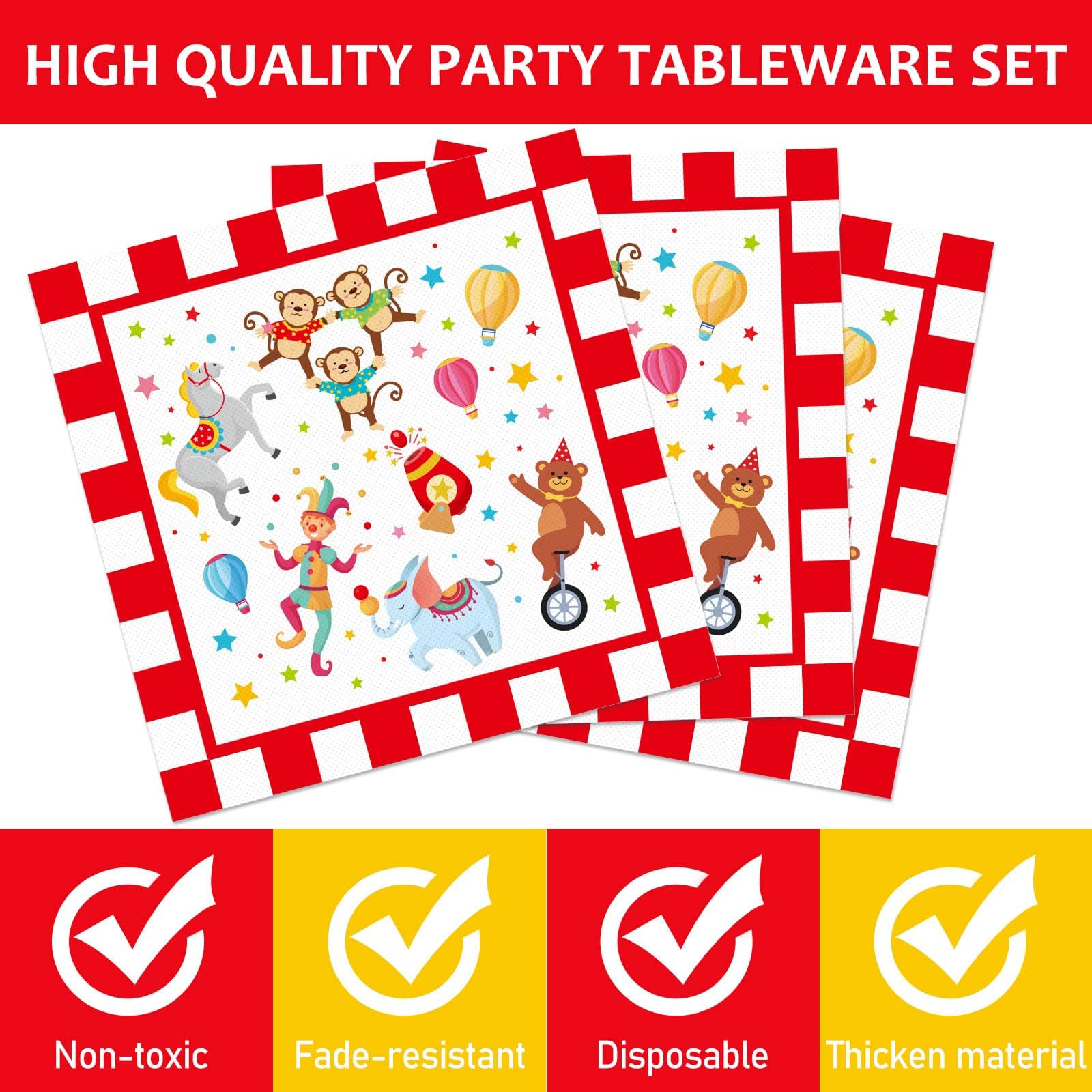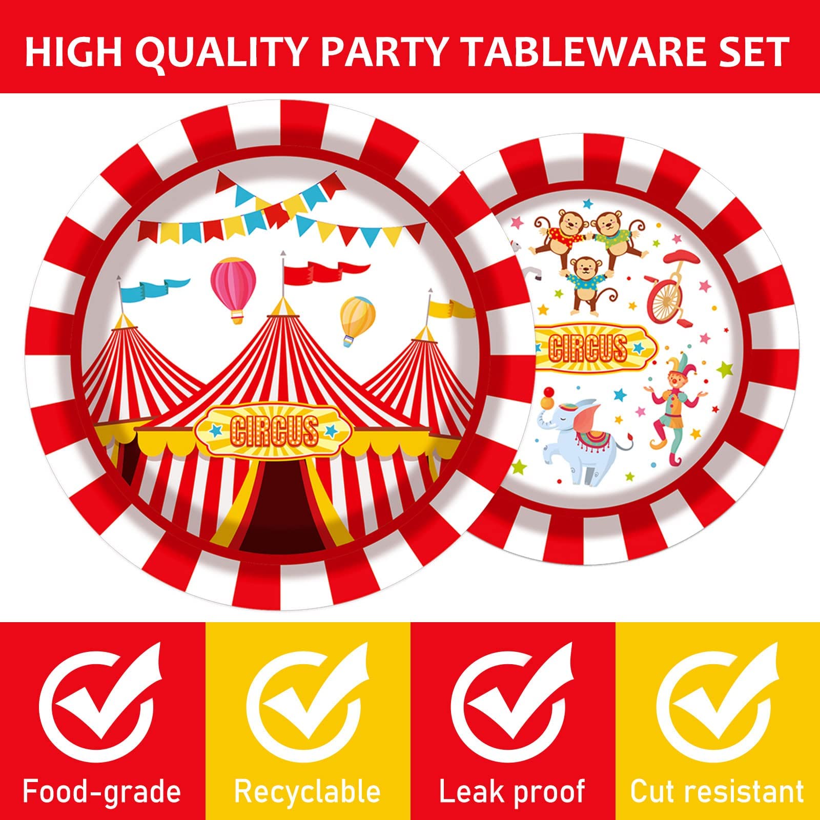 - Q: Can this circus-themed tableware be used for events other than birthdays? A: Absolutely! This versatile circus-themed tableware set is perfect for various celebrations, including baby showers, picnics, barbecues, and any festive gathering, accommodating guests of all ages.