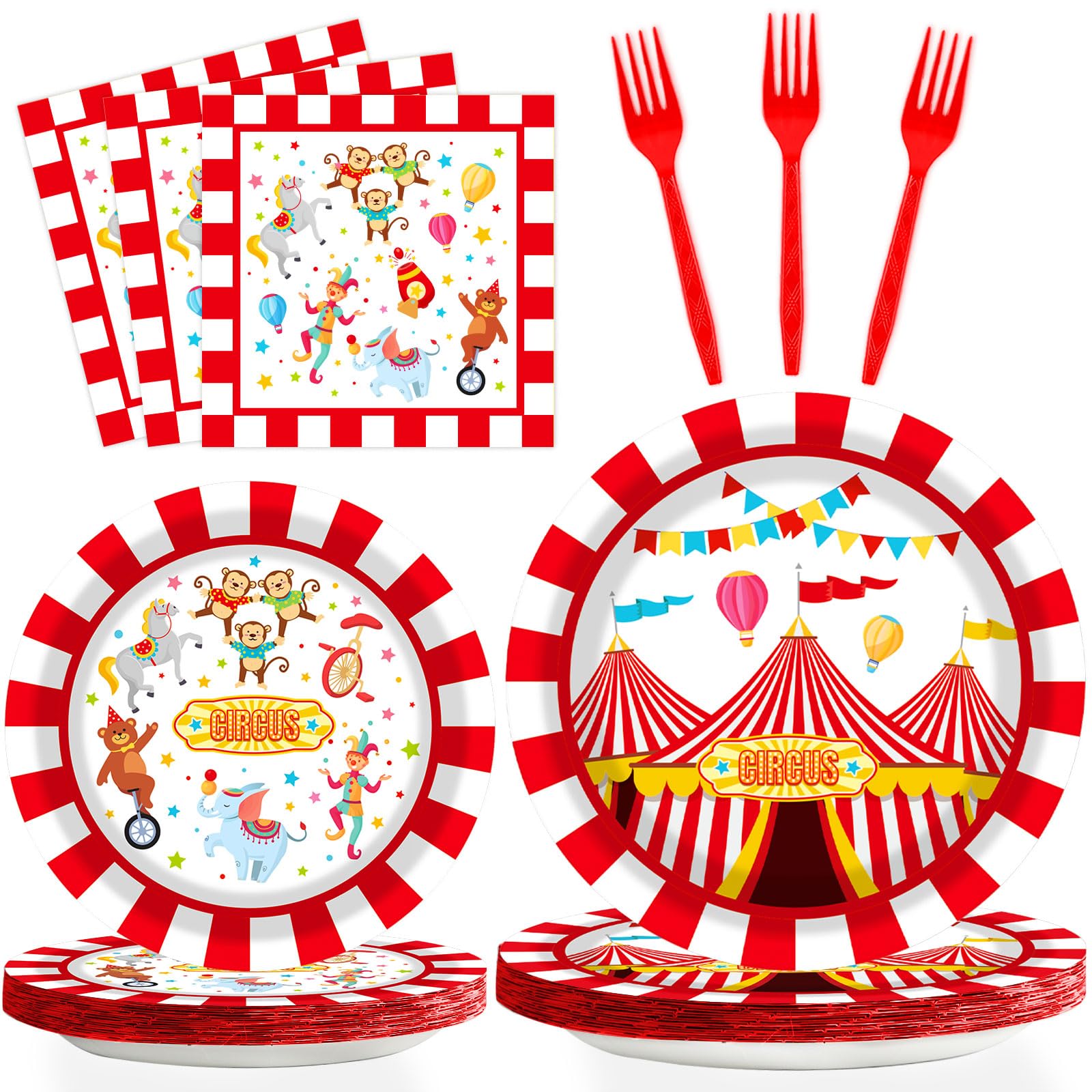 - Q: What is included in the gisgfim 96 Pcs Circus Party Supplies set? A: The gisgfim 96 Pcs Circus Party Supplies set includes 24 pieces of 9-inch dinner plates, 24 pieces of 7-inch dessert plates, 24 circus-themed napkins, and 24 plastic red forks, making it perfect for serving 24 guests.