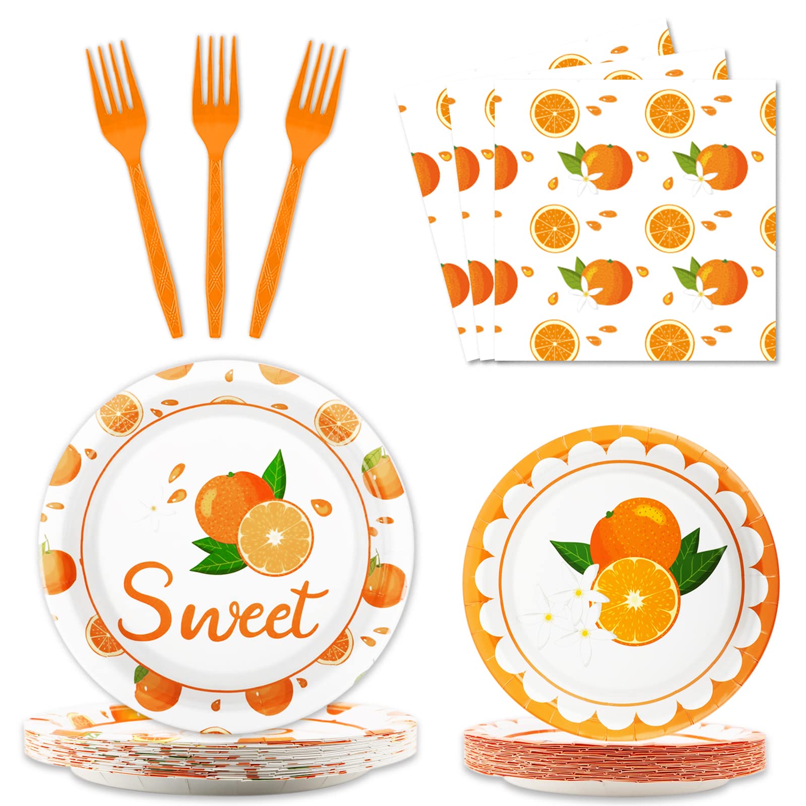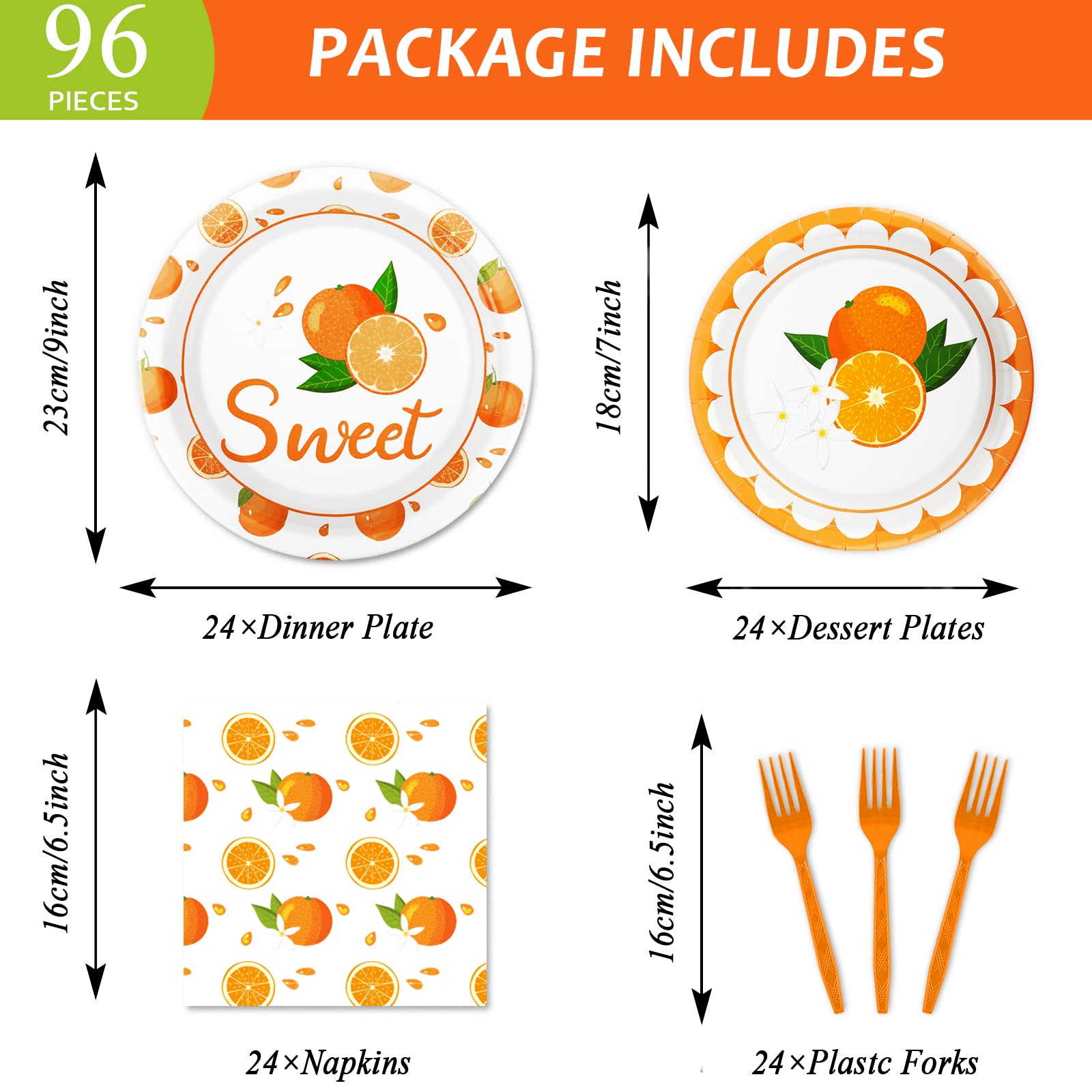 - Q: What is included in the Little Cutie Party Tableware Set? A: The Little Cutie Party Tableware Set includes 24 pieces of 9’’ dinner plates, 24 pieces of 7’’ fruit orange plates, 24 pieces of 6.5’’ tangerine napkins, and 24 plastic forks, making it perfect for serving 24 guests.