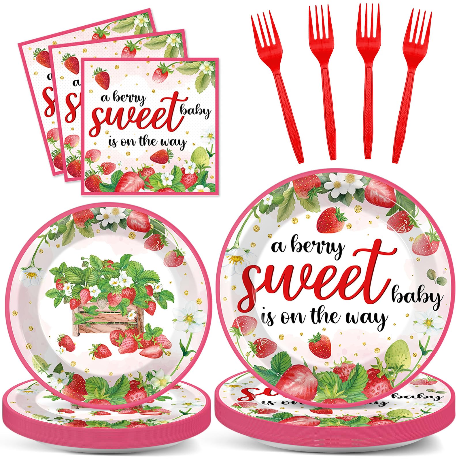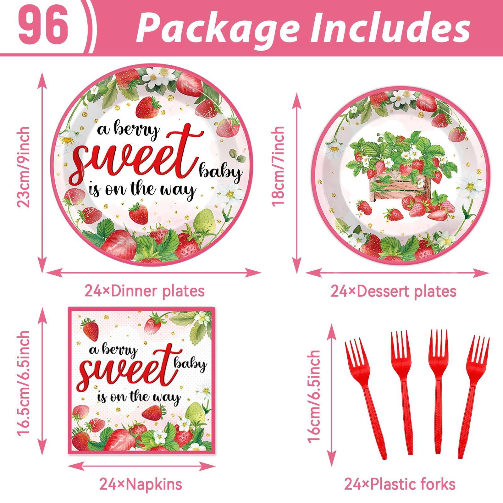 - Q: What is included in the gisgfim Strawberry Baby Shower Party Supplies set? A: The gisgfim Strawberry Baby Shower Party Supplies set includes 24 x 9-inch dinner plates, 24 x 7-inch dessert plates, 24 x 6.5-inch napkins (13 inches when unfolded), and 24 plastic red forks, totaling 96 pieces, designed to serve up to 24 guests.