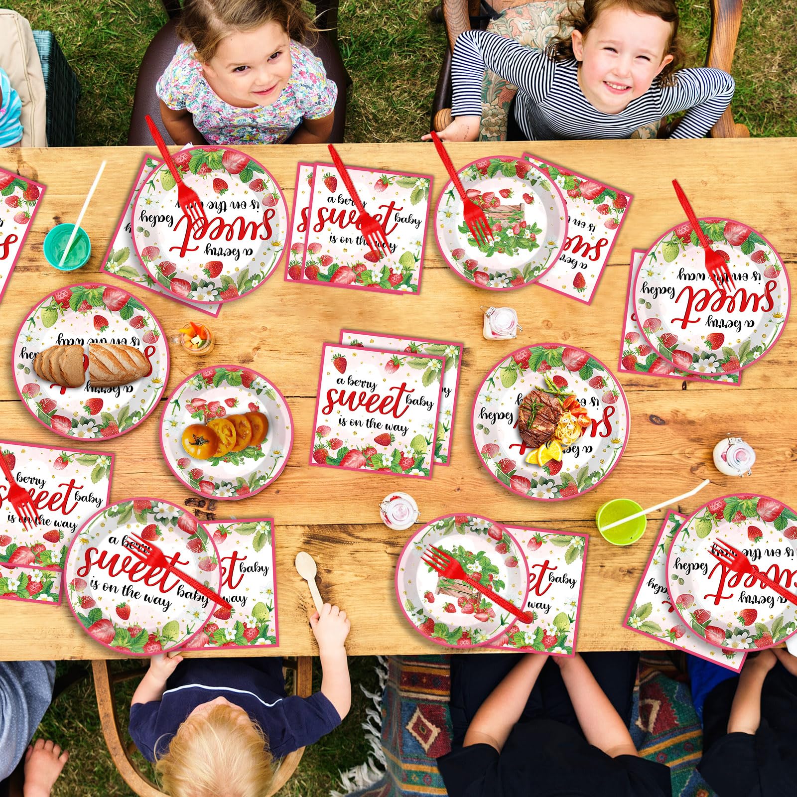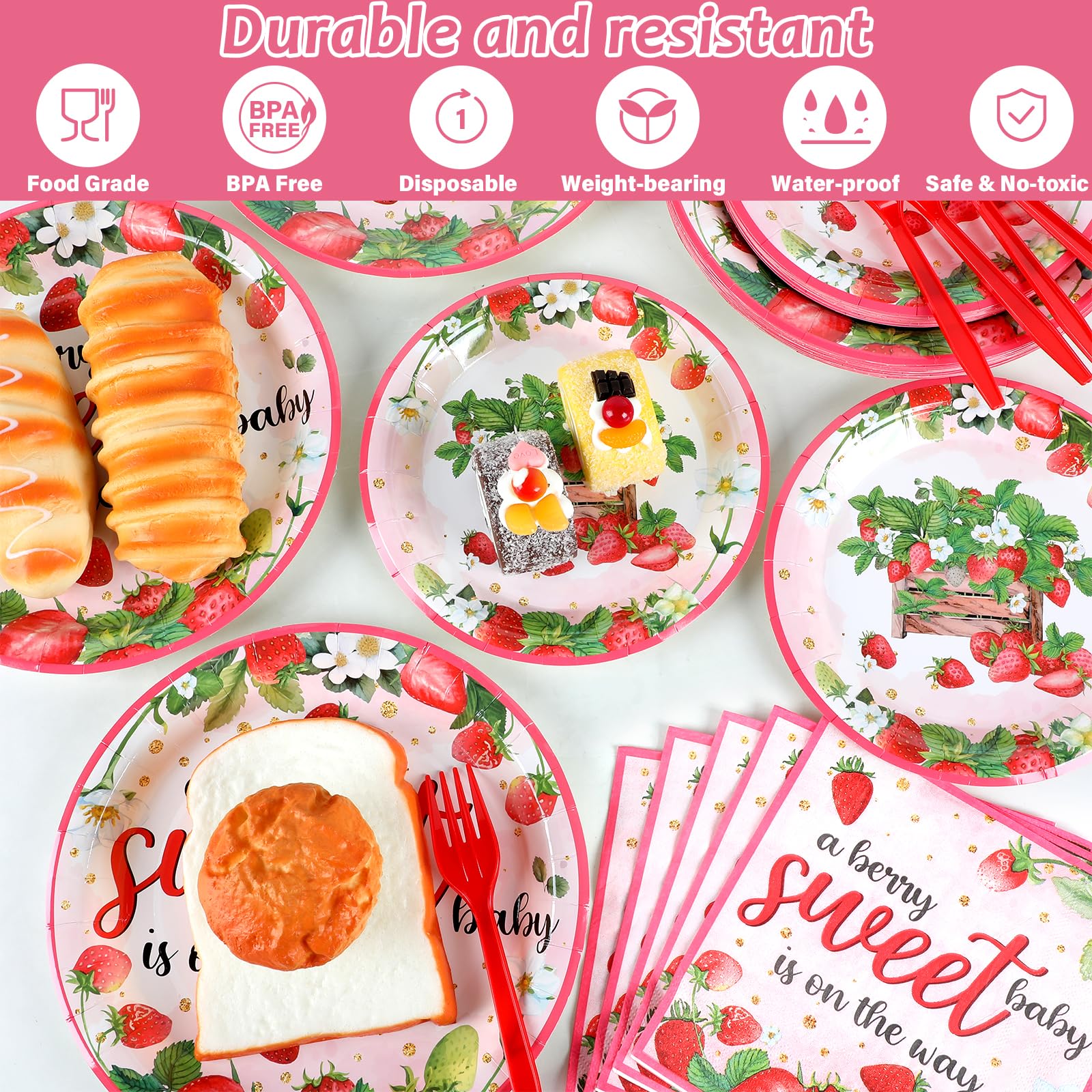 Gisgfim 96Pcs Strawberry Baby Shower Party Supplies Sweet Berry Paper Plates Napkins Summer Strawberry Birthday Tableware Set Fo