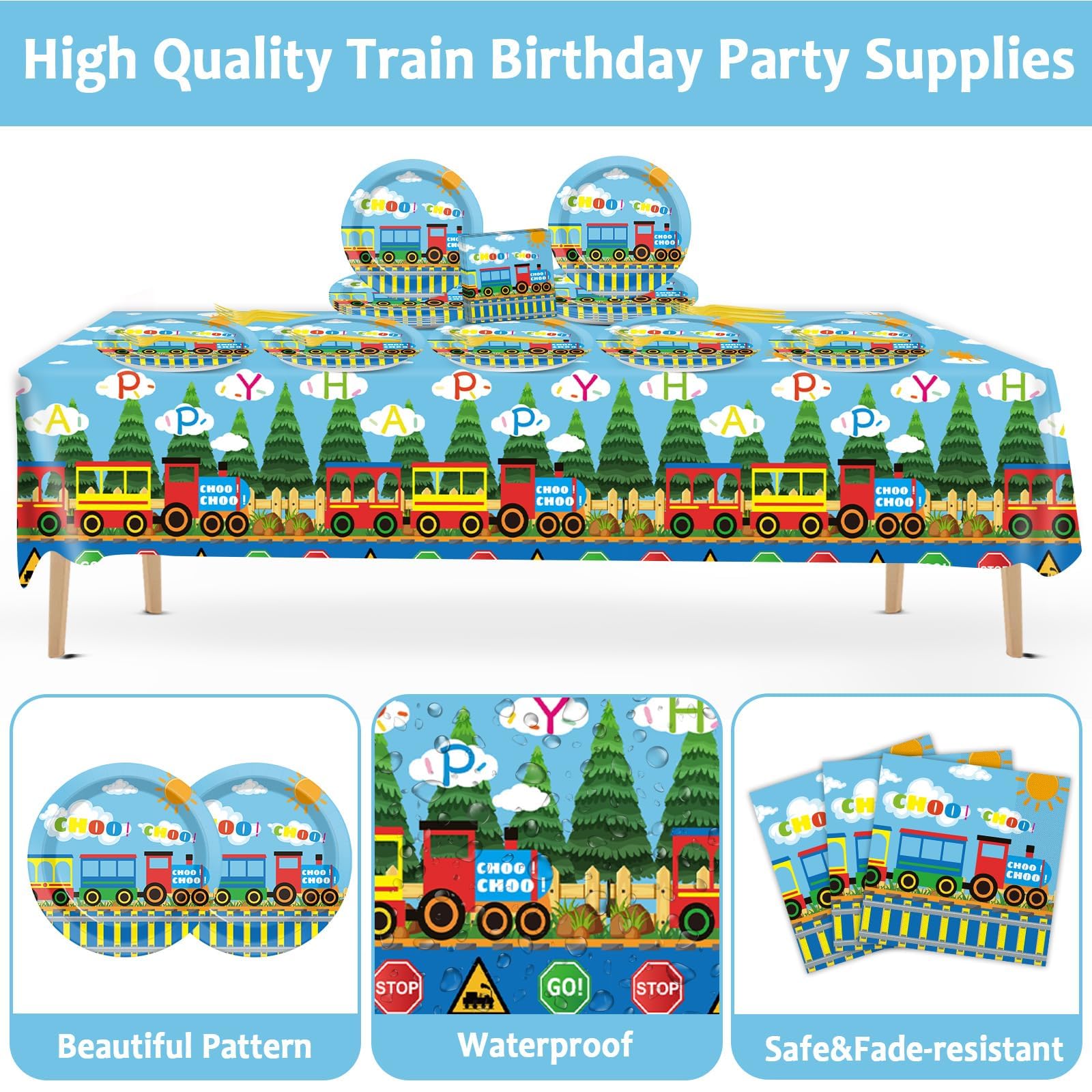 - Q: What items are included in the Train Birthday Party Supplies set? A: The Train Birthday Party Supplies set includes 20 pieces of 7-inch dessert plates, 20 pieces of 6.5-inch train-themed napkins, 20 yellow plastic forks, and 1 plastic tablecloth measuring 54 x 108 inches.