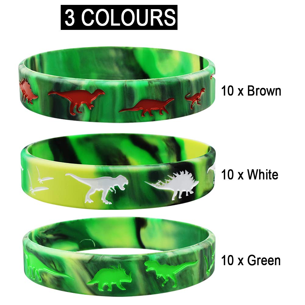 30 Pack Amazing Dinosaurs Wristband Feature: 3 Colors Dinosaurs Pattern Come with 3 colors dinosaurs pattern wristband. Green, Brown and White. 10 Pack for each color. Big Hit in The Parties Nice for dinosaurs theme parties. Your party will be full of joy with these wristband supplies. Universal Size for Kids and Teenagers The size of the wristbands can be slightly stretched. Fit for most Kids and Teenagers. Package Included: 30 x Dinosaur Style Silicone Wristbands - 10 x Green - 10 x Brown - 10 x White Dimension: Diameter: 2.5 inch / 6.3 cm Length: 7.5 inch 19 cm Width: 0.45 inch / 1.1 cm