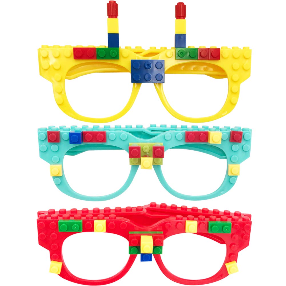 - Q: How many glasses and building bricks are included in the set? A: The set includes 9 glasses frames in three colors (3 yellow, 3 red, and 3 cyan) along with 9 packets of colored building bricks for creative fun.