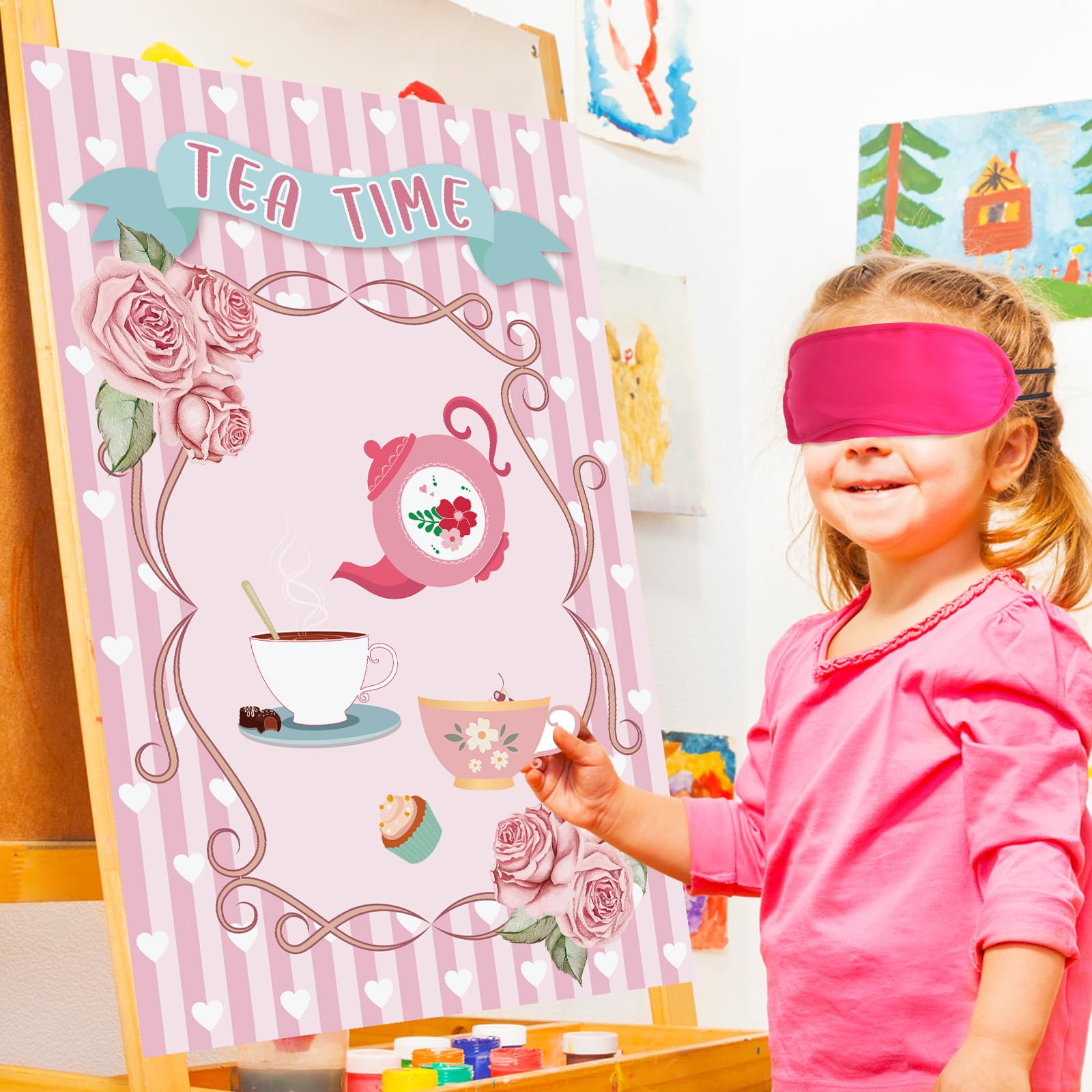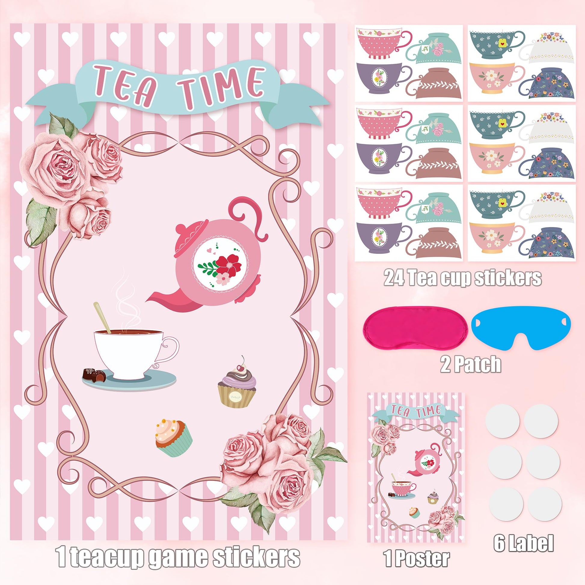 - Q: What is included in the Hooqict Tea Party Games set? A: The Hooqict Tea Party Games set includes 1 large tea party poster, 24 teacup stickers, and 2 eye masks, providing everything you need for a fun and engaging party game.