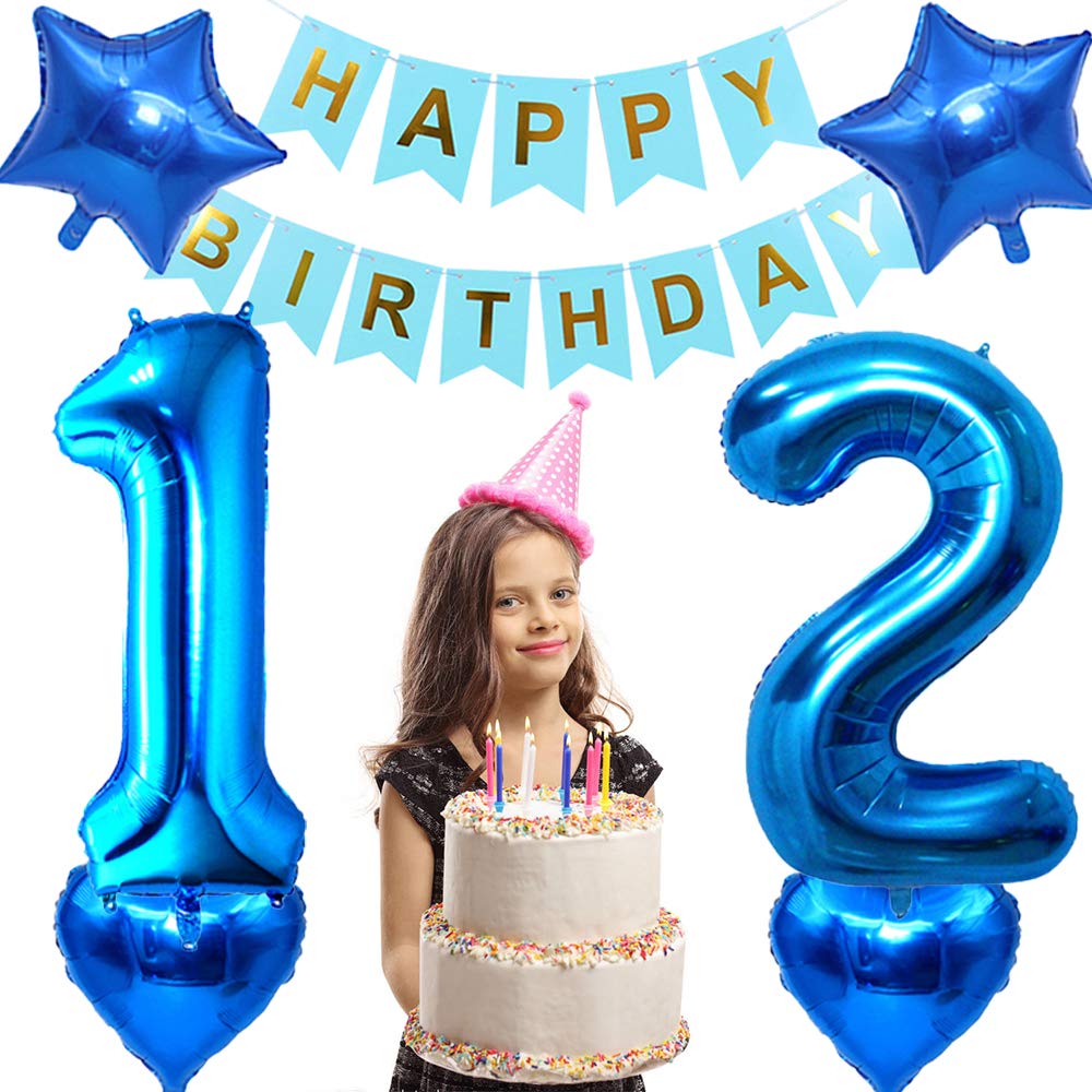 Huture 12 Birthday Party Supplies Blue Number 12 Foil Balloon Happy Birthday Banner Kit 12Th Birthday Decoration White Blue Late