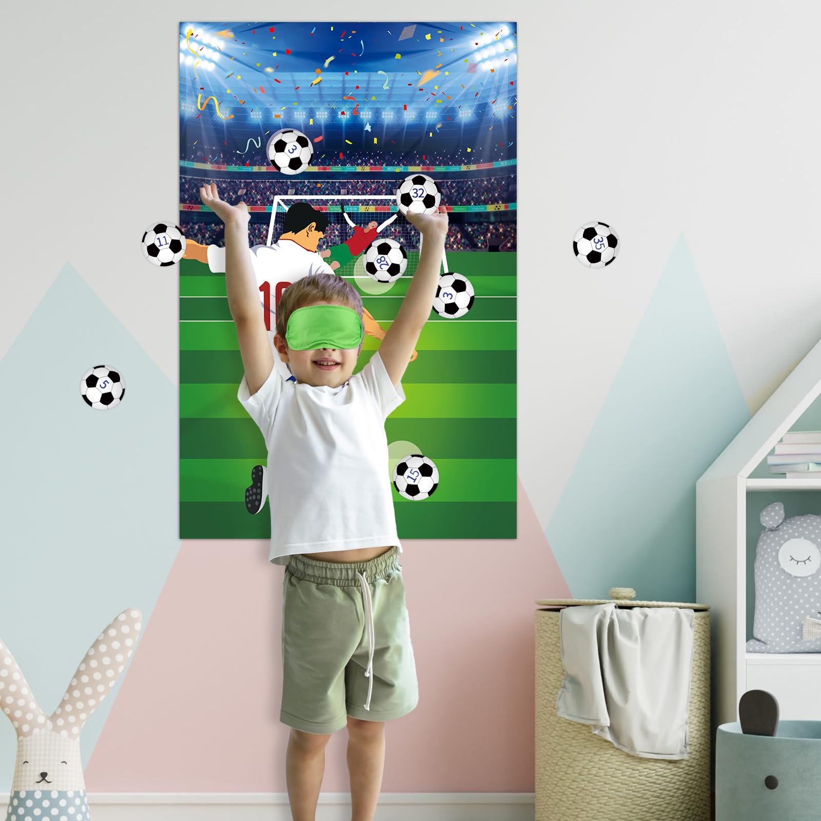- Q: How do you play the Pin The Soccer Ball game? A: To play, attach the poster to a wall using the adhesive tape provided. Players wear the blindfold and attempt to stick the soccer ball stickers on the poster. The player who gets the closest to the goal wins the game.