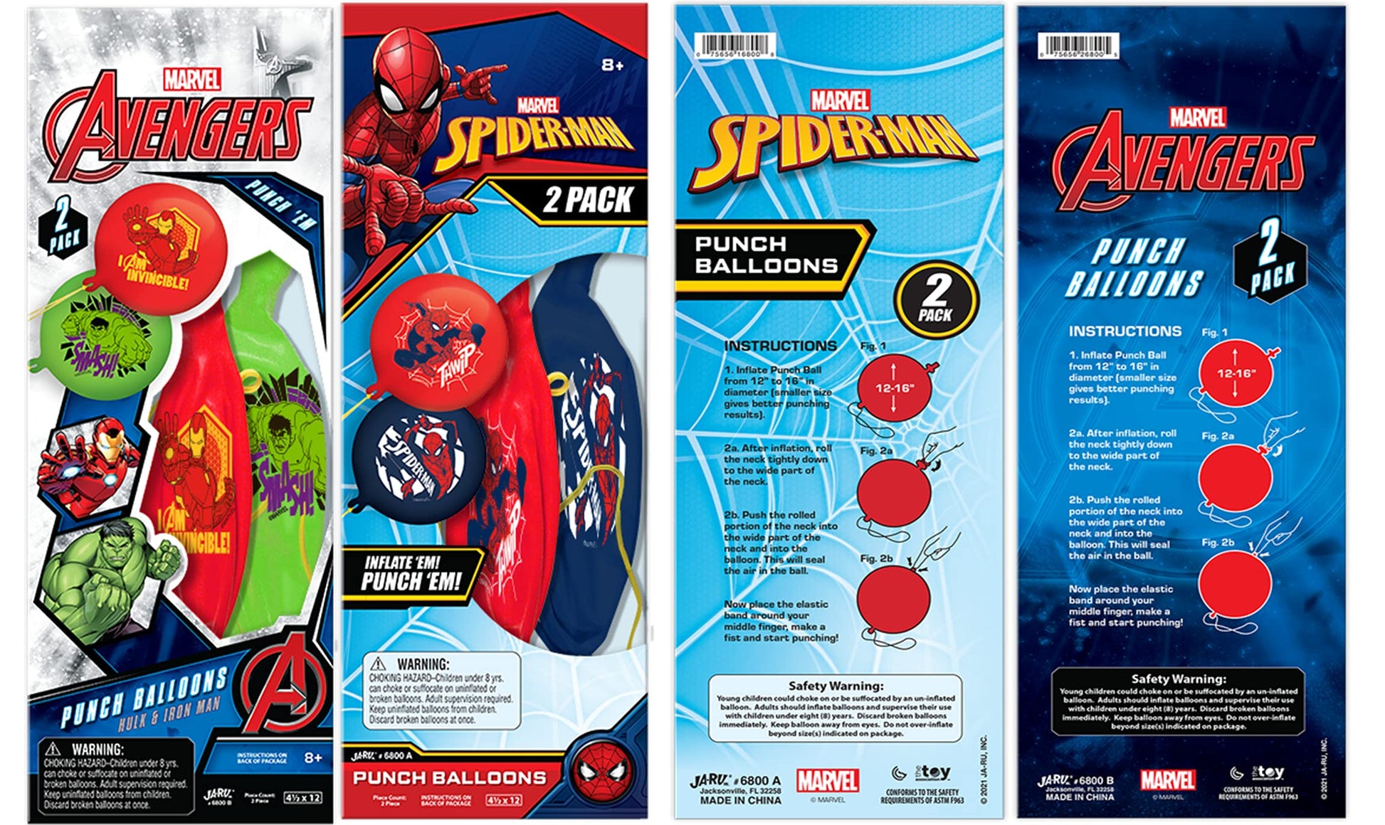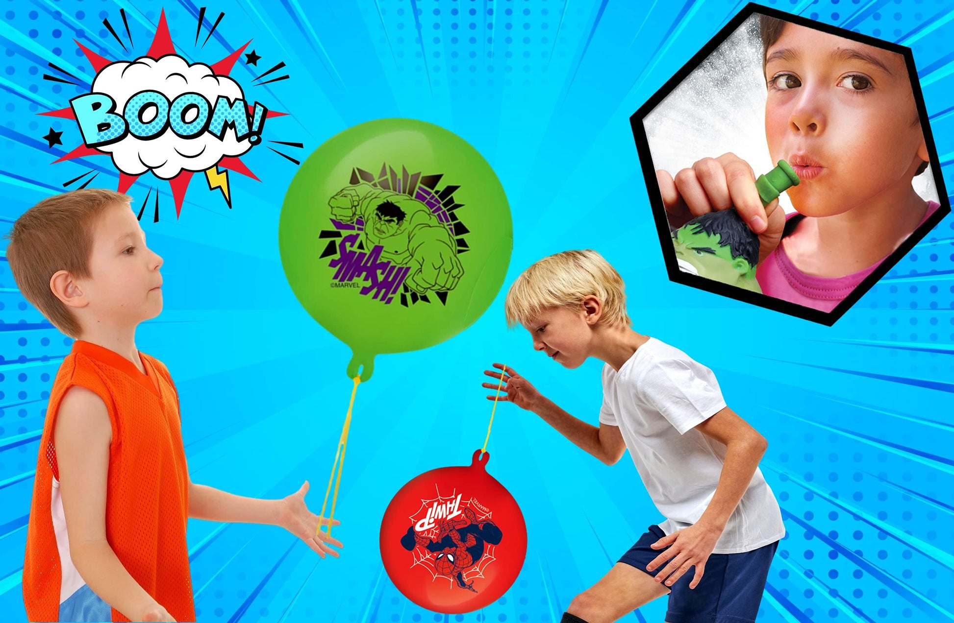 JARU MARVEL TOYS. LARGE Spideman, Hulk and Iroman Styles, PUNCHING BAG BALL 8+. Inflate it & punch it! Inflates up to 16 inches Wacky wiggly motion! Instructions on back of package. Latex free rubber. Colors and styles may vary. Meets CPSC safety requirements. Usage Instructions: 1. Blow air into punch ball tube. Inflate up to 16 inches. Do not over inflate. 2. Tie a knot using the tube. 3. Place finger through the loop and now you're ready to play. Constructed from durable vinyl the JA-RU Brand Googly Ball can take a beating and is designed for pop it abuse. Stretchable Material Sealed Air Provides Fun Air Bubbles Great Fidget Toy For Indoor or Outdoor Use. Beating Ball Stress toy, with a touch of gentil feel. Jumbo puffer ball collection features Super Heroes and a super-squeezable texture, distinguishing it from the norm. Spiderman Toys, Superhero Toys, Marvel Toys, Super Hero Toys, Hulk Toys, Marvel Gifts, Spiderman Birthday Toy Decorations, spider man toys, marvel stuff, Fidget Pack, Avengers Birthday Decorations, Hulk Action Figure Bouncy Ball.