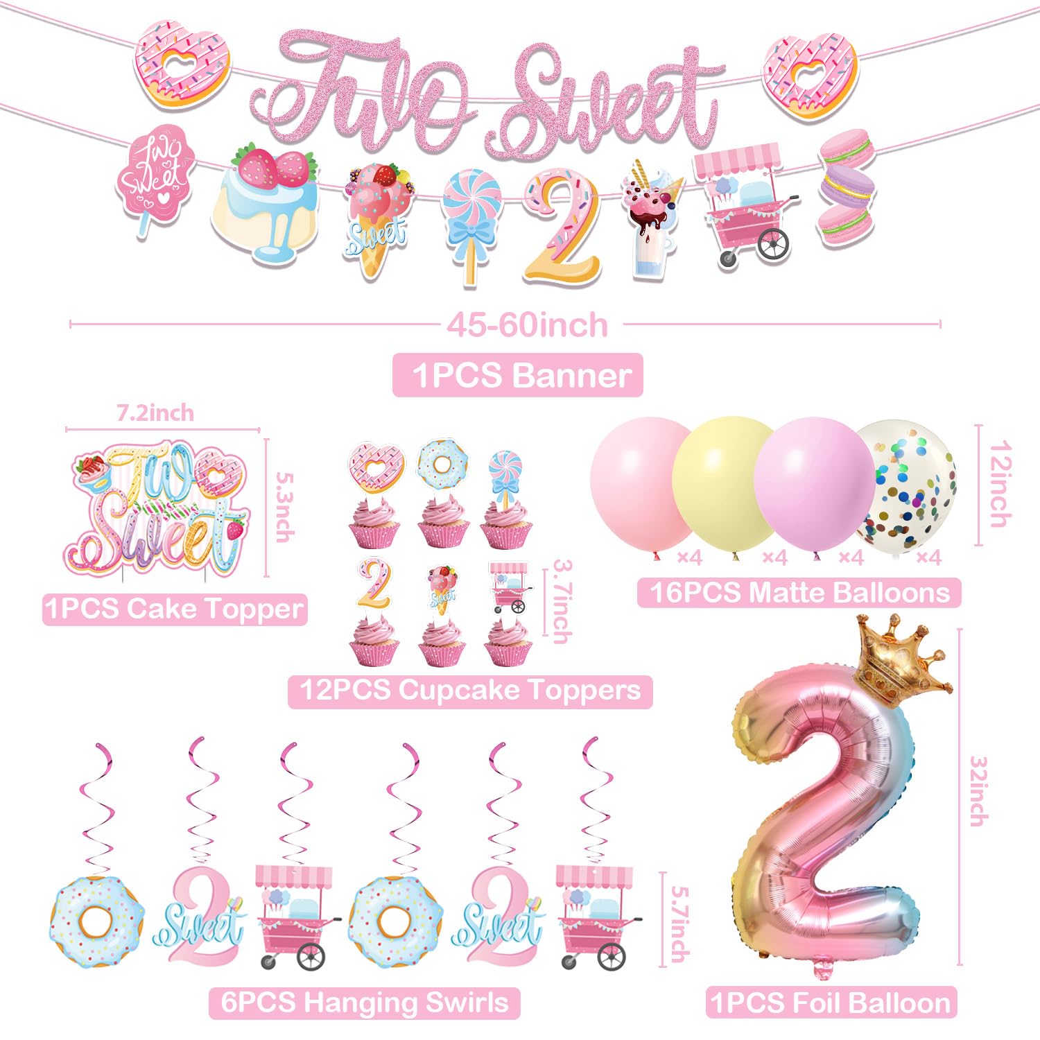 - Q: What items are included in the JUYRLE Two Sweet Birthday Party Decorations set? A: The JUYRLE Two Sweet Birthday Party Decorations set includes a 'TWO SWEET' ice cream and donut banner, two foil balloons, a pink cake topper, six hanging swirls, 16 latex balloons, and 12 dessert cupcake toppers, making it perfect for a vibrant 2nd birthday celebration.