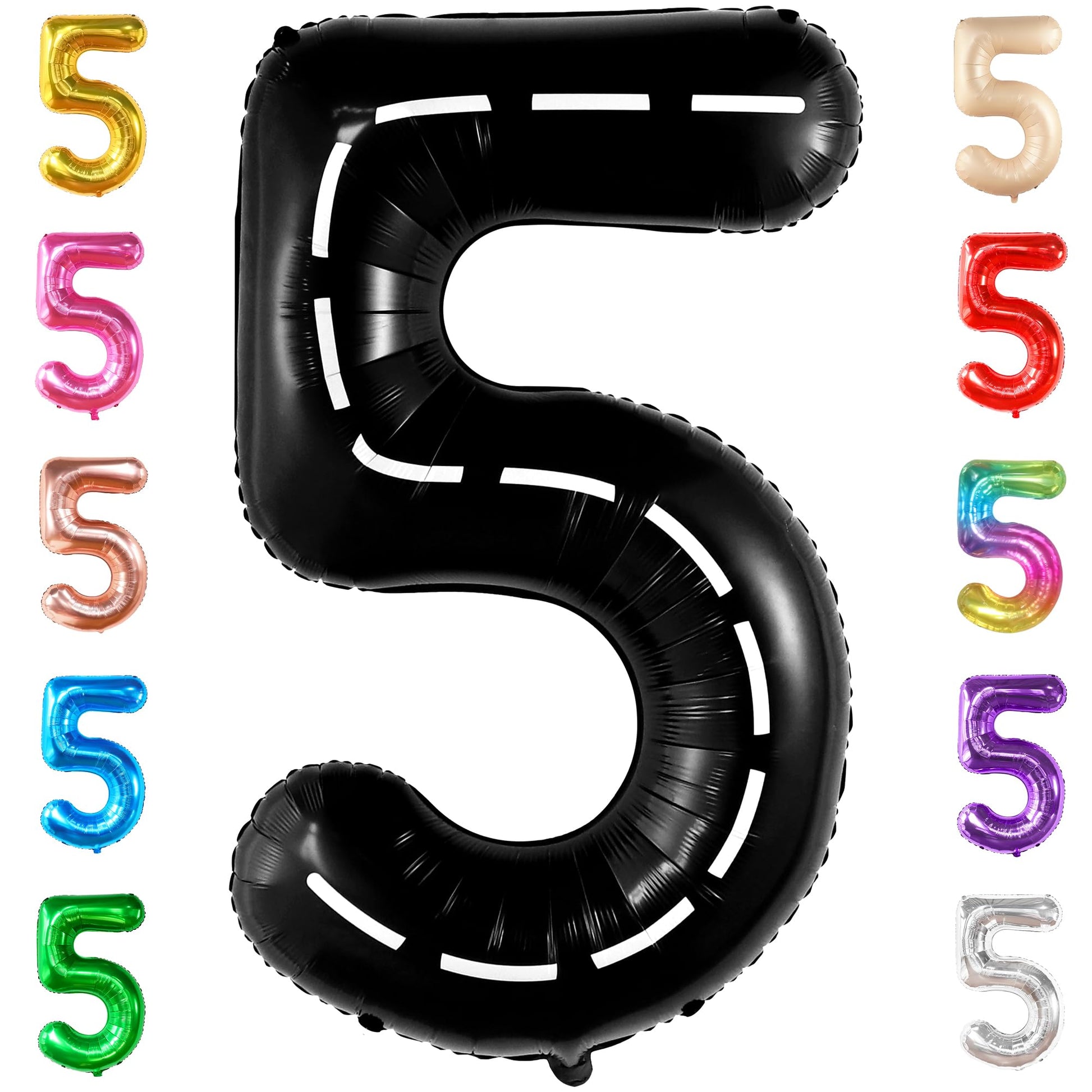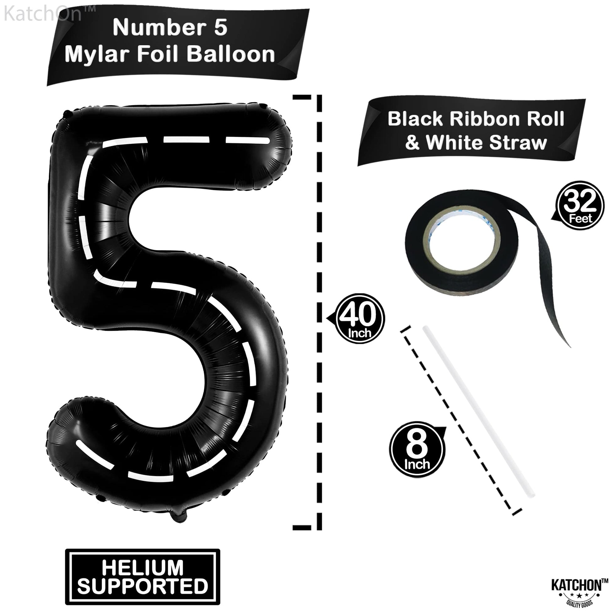 Katchon, Number 5 Race Car Black Balloon - Giant 40 Inch, Party Supplies, Hotwheel Birthday Decorations, Unisex, All Ages, 3 Pieces