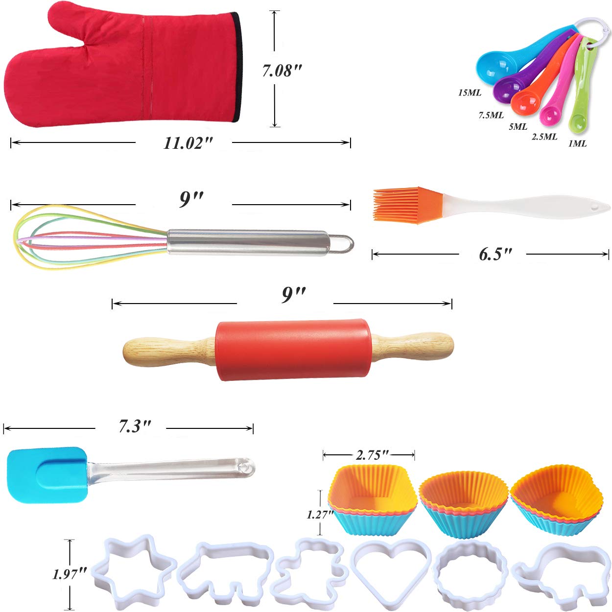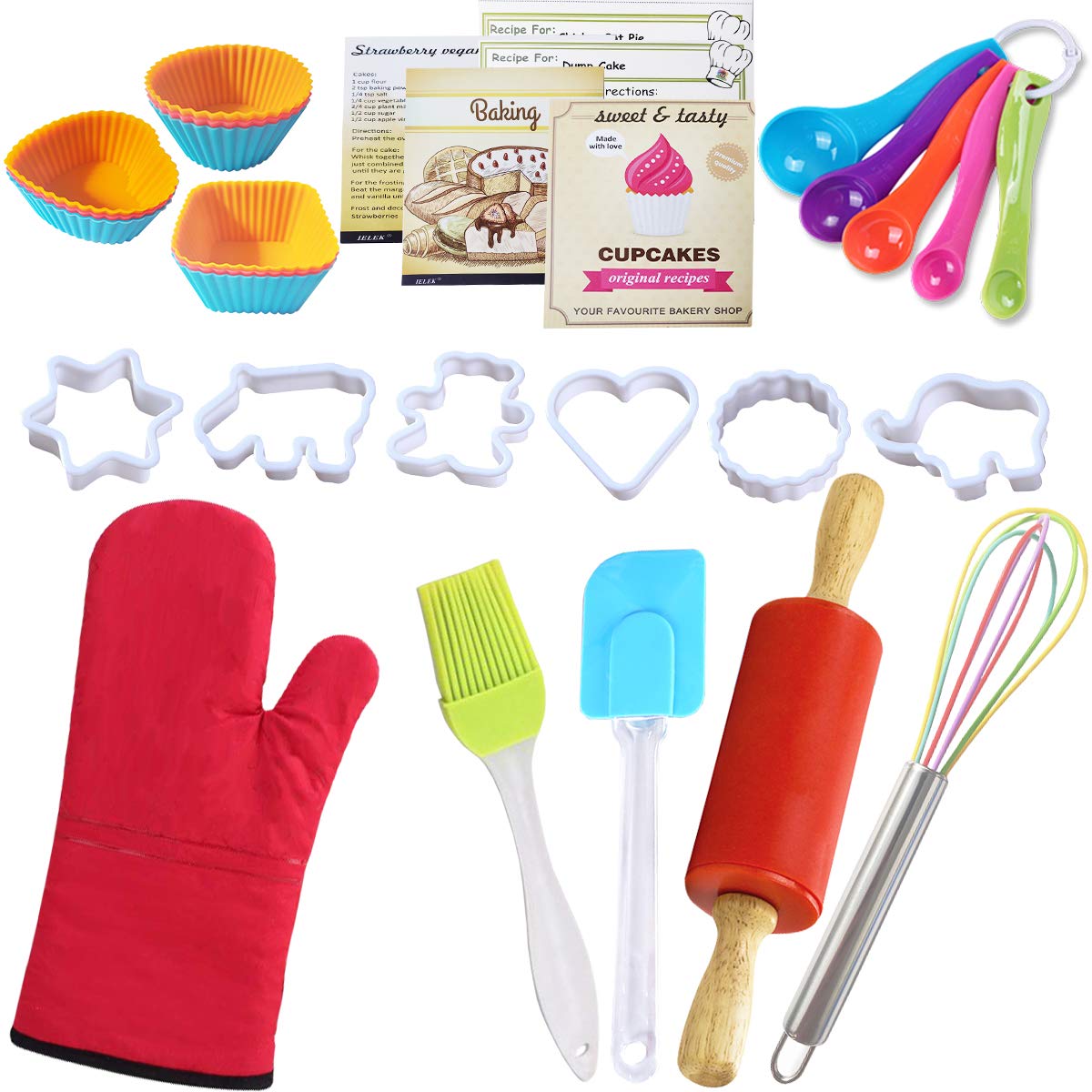 - Q: What items are included in the baking kit? A: The set includes 32 pieces such as an apron, chef hat, oven mitt, rolling pin, spatula, pastry brush, whisk, measuring spoons, cookie cutters, silicone baking cups, and recipe cards.