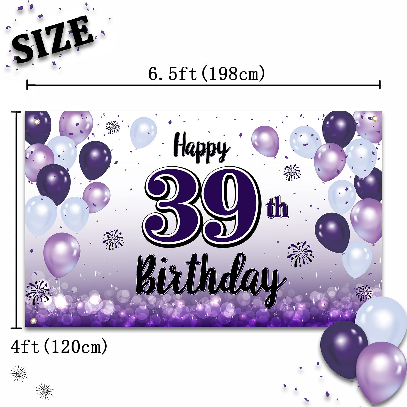 LASKYER Happy 39th Birthday Decorations,39th Purple Balloon Large Birthday Banner Backdrop Sign,39 Years Old Bday Party Supplies