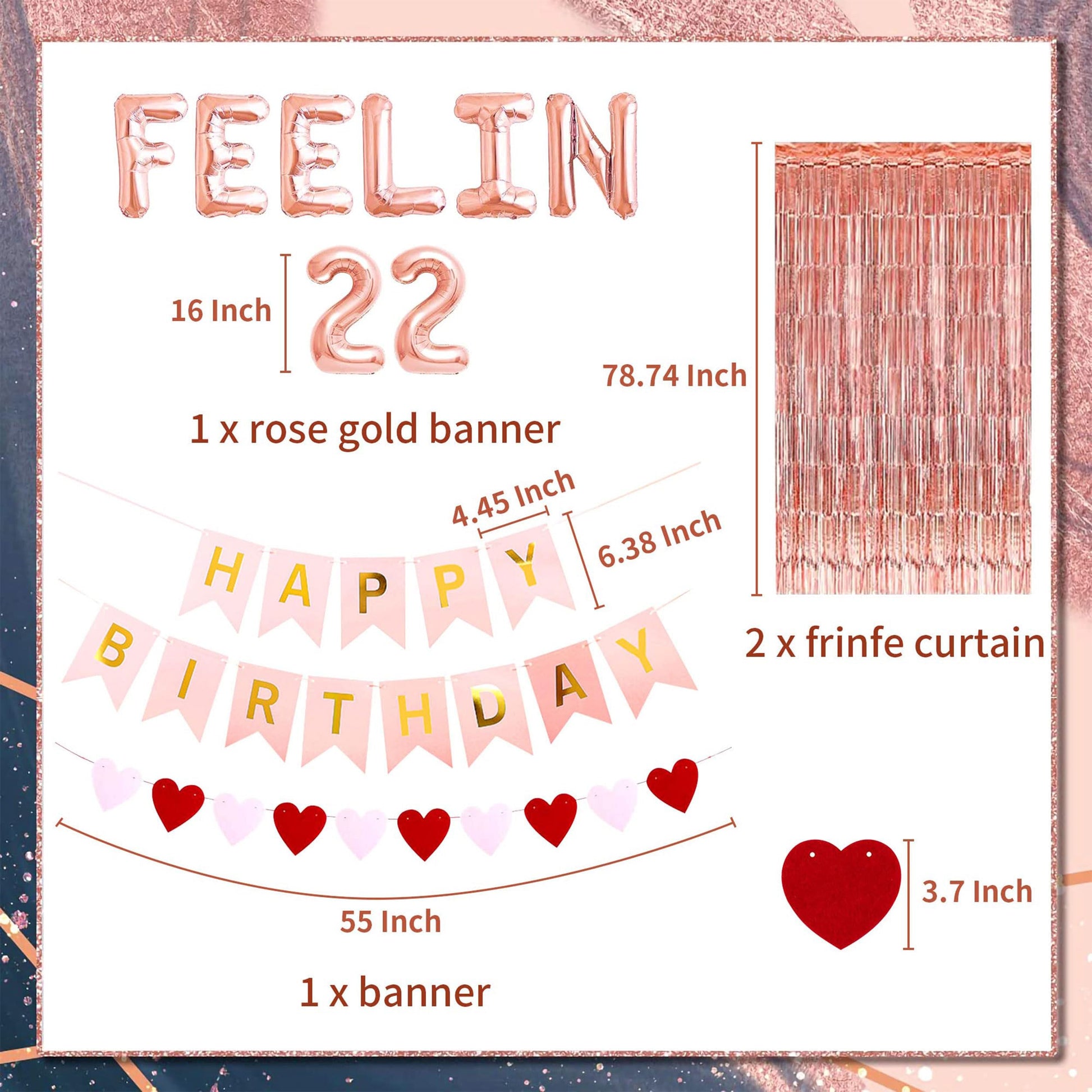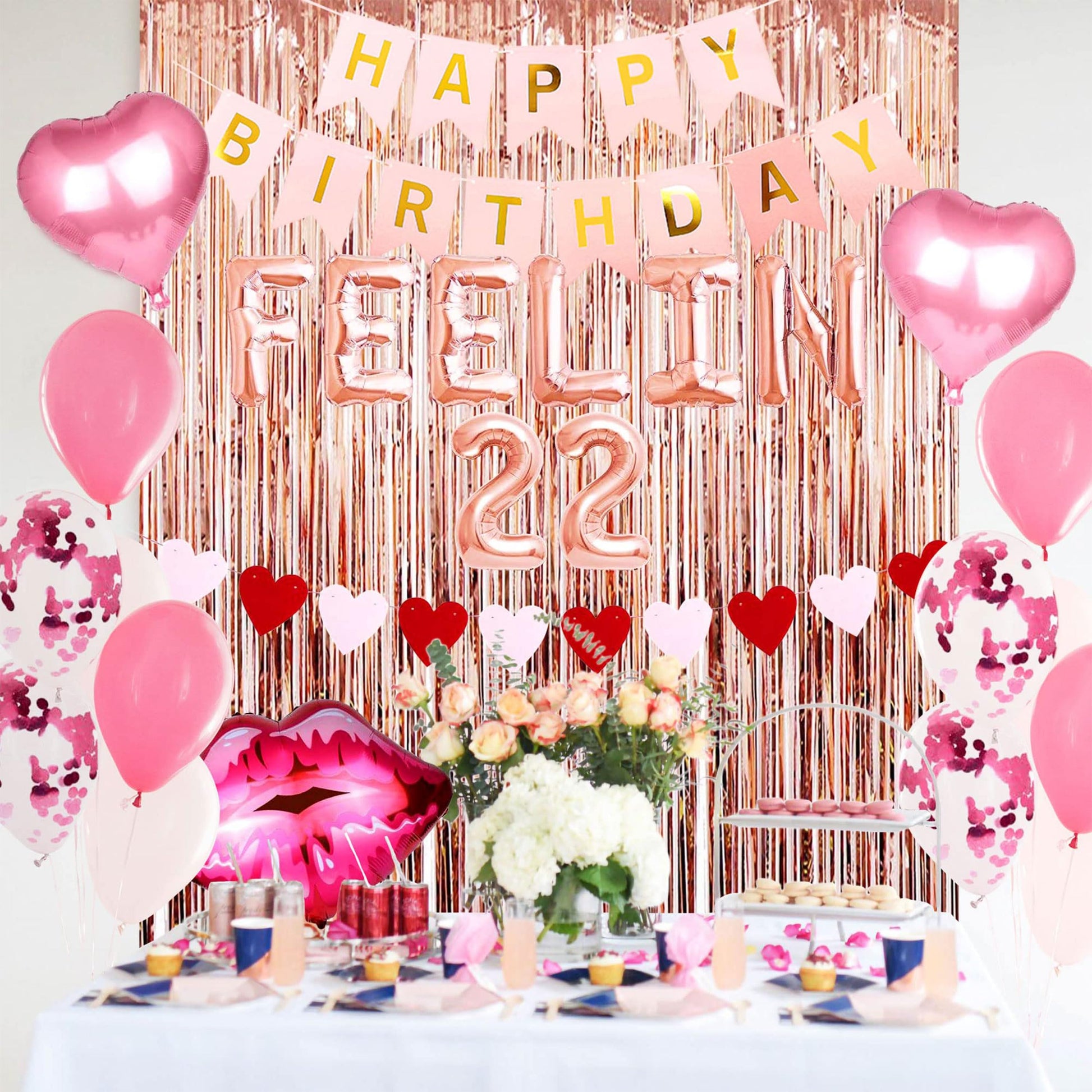 - Q: What items are included in the LaVenty 66 PCS Luxury Feelin 22 Birthday Party Supplies? A: The LaVenty 66 PCS Luxury set includes 16-inch Feelin 22 balloons, a HAPPY BIRTHDAY banner, 2 foil fringe curtains, 1 red clips balloon (26*18 inches), 8 red balloons (12 inches), 8 white balloons (12 inches), 12 pink balloons (12 inches), 2 aluminum film love balloons (18 inches), 1 love balloon (23 inches), and 10 heart-shaped felt pull flags totaling 55 inches.