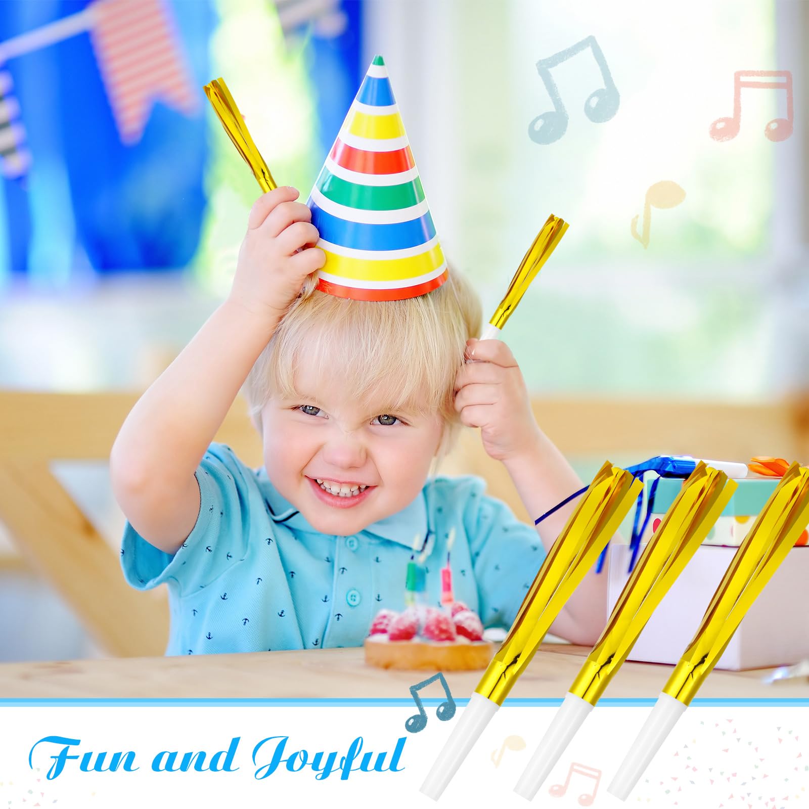 Celebrate the arrival of a new year with these 30 pieces of metallic fringed noise makers in a shimmering gold hue. These party horns are suitable for various occasions, such as birthday party, wedding, baby shower, New Year's Eve, carnival, school activities and more, creating a festive atmosphere, making your party more interesting. Distribute them among your guests and let everyone join in the revelry as the clock strikes midnight. With their eye-catching gold color and fringed design, these noise makers are sure to be a hit at your party. Package includes: 30 x Glitter metallic fringed noise makers Specifications: Material: plastic and paper Size: approx. 0.59 x 6.3 inches/ 15 x 160 mm Color: Gold white Note Please: Please understand that manual measurement may have slight size error. The colors may exist slight difference due to different screens.