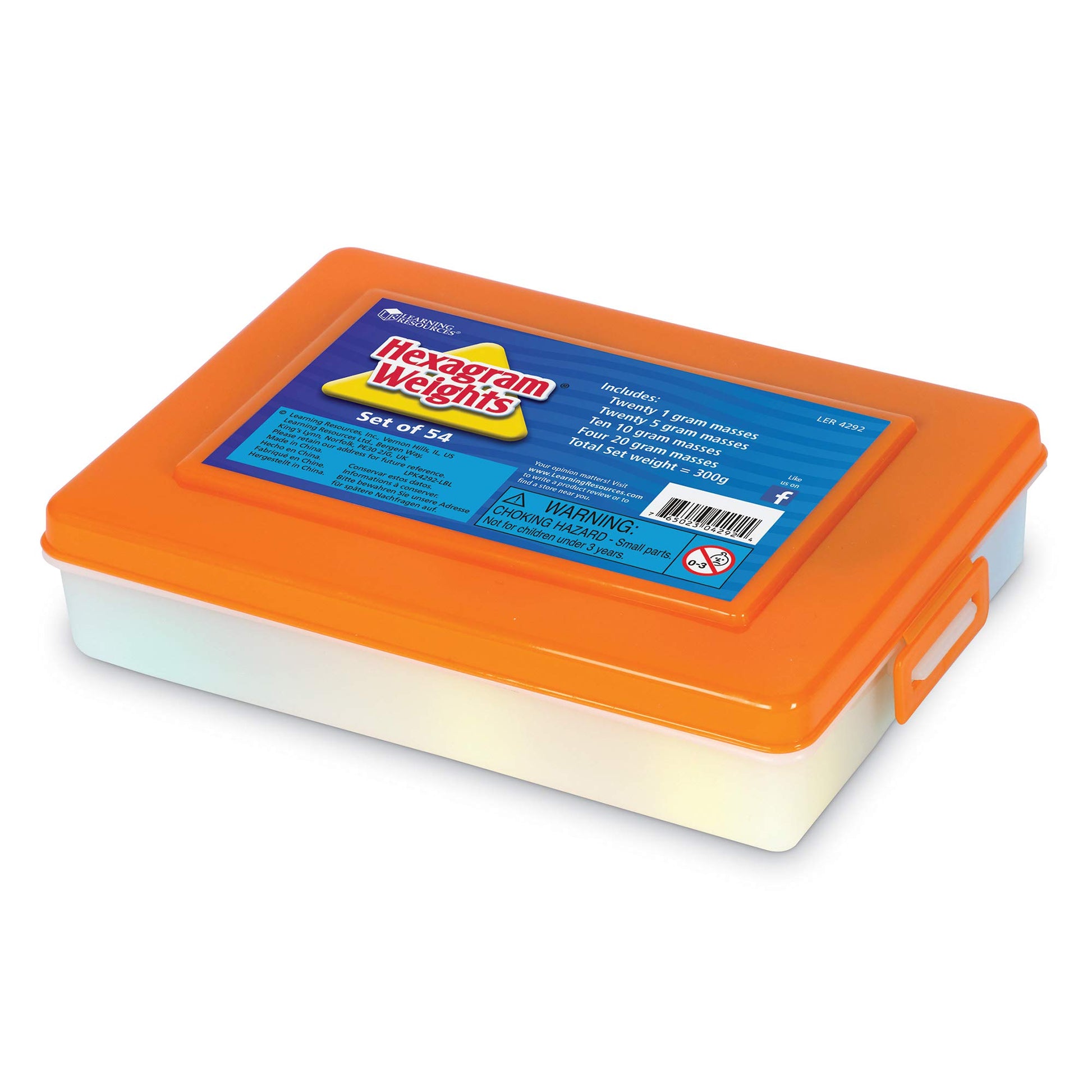 The Learning Resources Hexagram Metric Weight Set will engage little learners in a wide variety of measuring activities. These durable and accurate plastic hexagrams are color coded and can be used with any balance. The Learning Resources Hexagram Metric Weight Set - 54 Piece Features: 20 Each of 1 gram and 5 gram weights Ten 10 gram weights Four 20 gram weights Durable plastic construction Plastic storage box