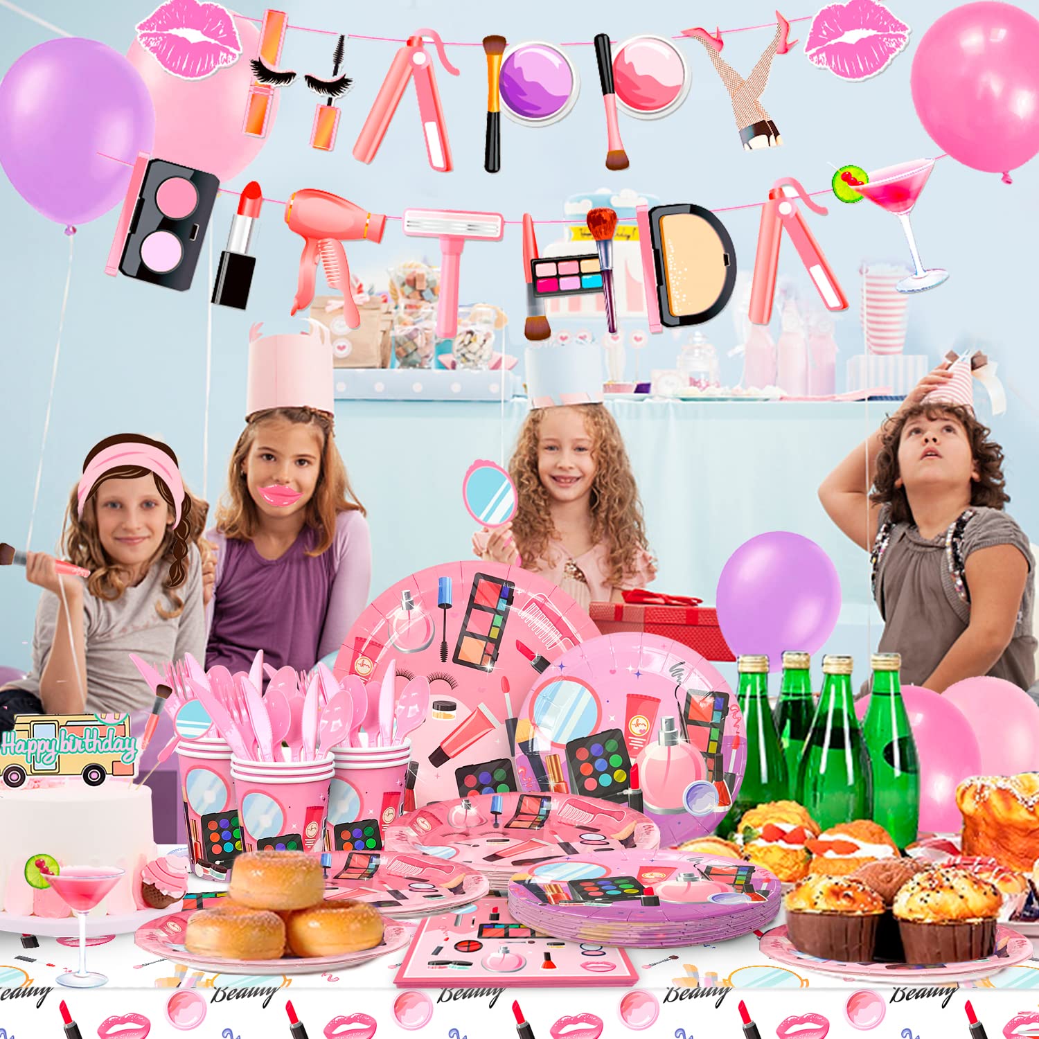 - Q: What items are included in the Makeup Birthday Party Supplies set? A: The Makeup Birthday Party Supplies set includes 165 pieces such as a spa party banner, makeup party tablecovers, 12 spa party balloons, 16 7-inch spa party plates, 16 9-inch makeup plates, 16 makeup party cups, 16 makeup party napkins, and 25 spa photo booth props.