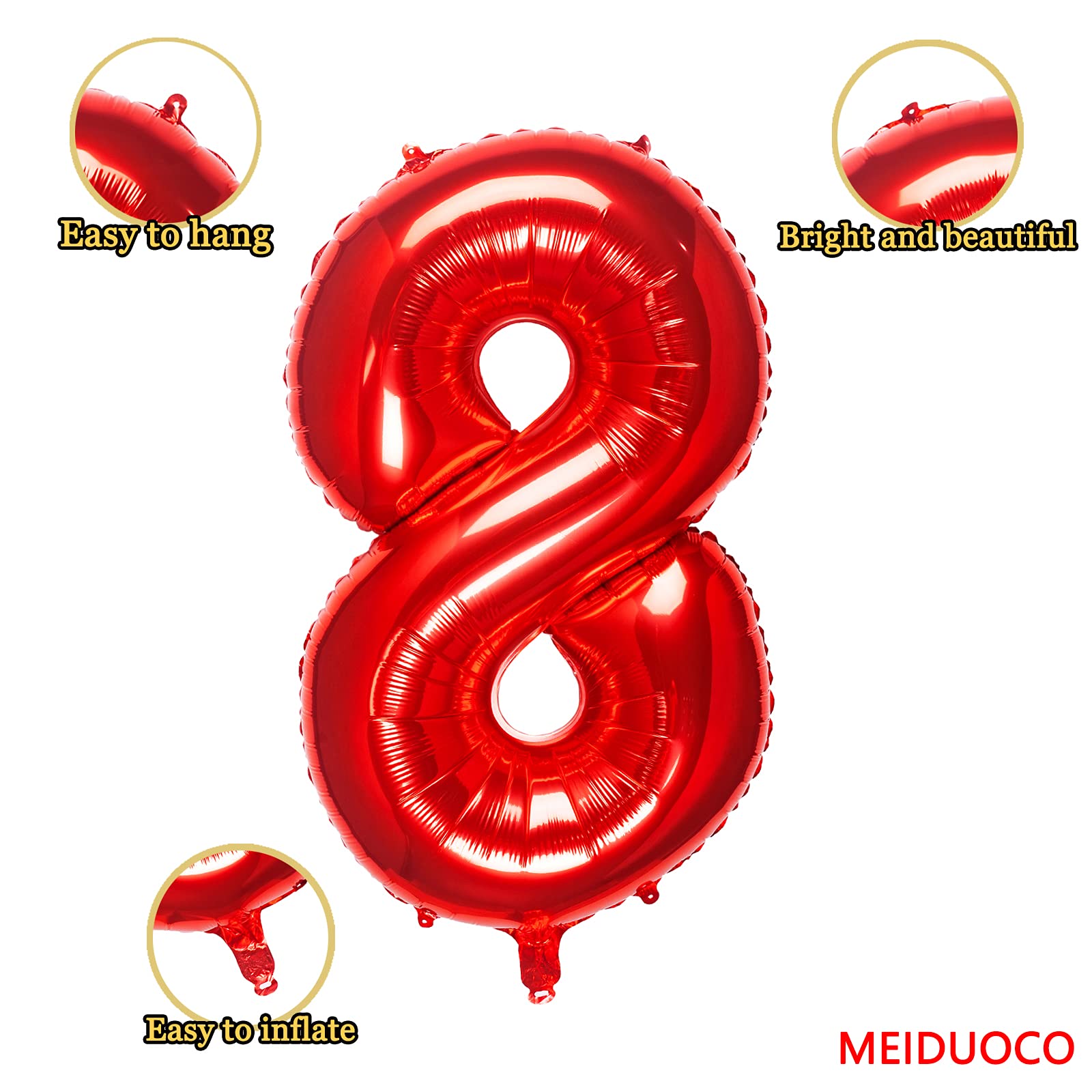 - Q: How do I inflate the MEIDUOCO Red 8 Number Balloon? A: To inflate the MEIDUOCO Red 8 Number Balloon, locate the self-sealing valve and use either an air pump or a straw. Inflate the balloon slowly, filling it to about 85% capacity for best results.