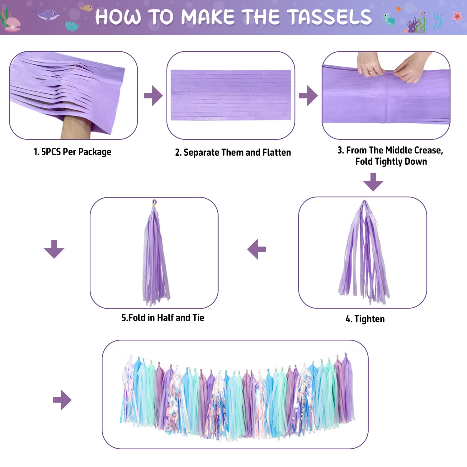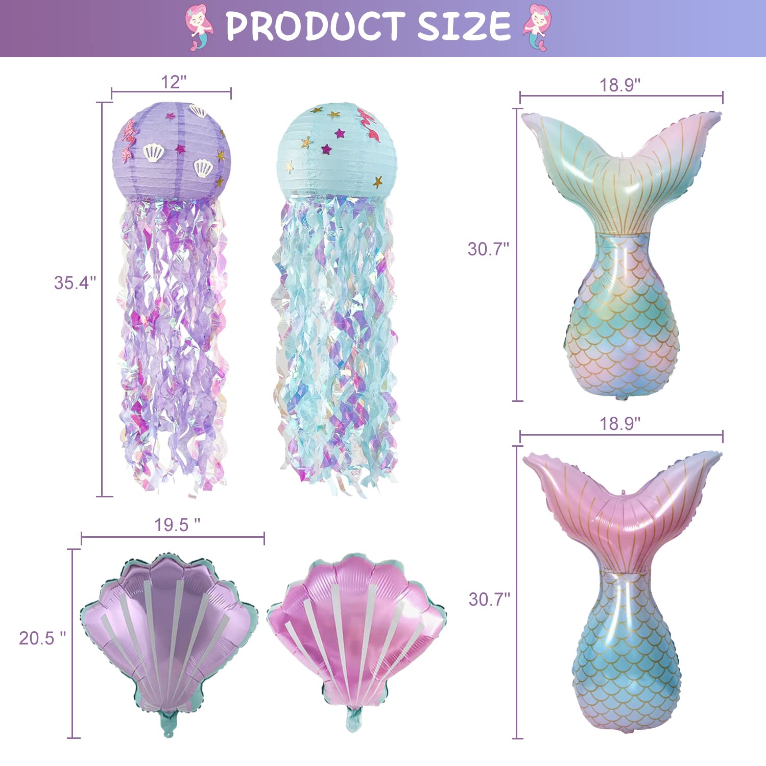 - Q: What items are included in the Mermaid Birthday Party Decorations set? A: The Mermaid Birthday Party Decorations set includes a mermaid happy birthday banner, a tassel garland, a bubble garland, two jellyfish paper lanterns, eighteen latex balloons (6 Purple, 6 Confetti, 6 Blue), four foil balloons, one cake topper, and twelve cupcake toppers.