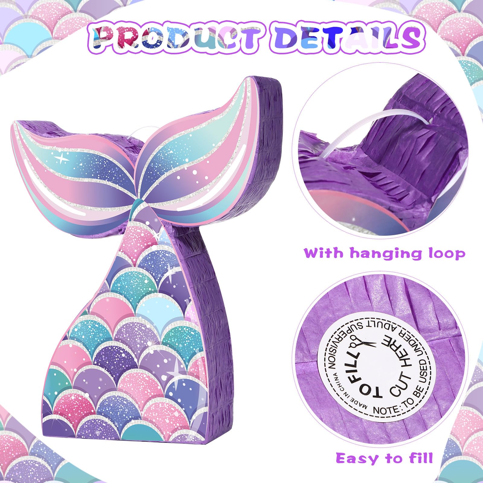 Features: Mermaid birthday party supplies: Add this cute under the sea piata to your under the sea party decorations, or match with other forms of decorations for more fun party times. You can hang it on the tree, railing, or roof, kids will definitely love this piata with so much capacity to hold their favorite candies. Attractive design: The mermaid party supplies are shaped with shiny mermaid and fish scales, the pink, purple and blue colors go well with mermaid ocean theme. Specifications: Main material: paperMain color: pink, purple and blueSize: approx. 16.14 x 12.40 x 2.95Package includes: 1 x Mermaid tail piata1 x Blindfold1 x piata stickNotes: Manual measurement, please allow slight errors on size. The color may exist a slight difference due to different screen displays.