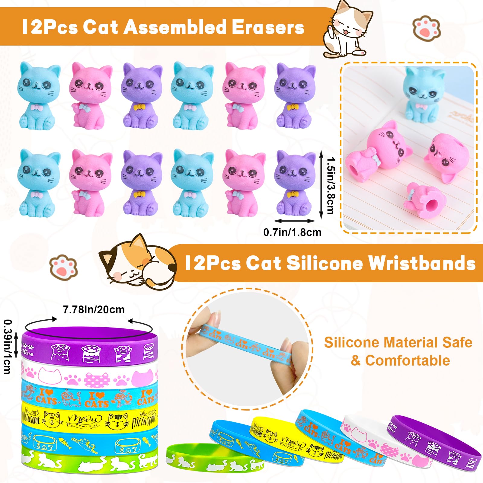 • Q: What types of items are included in the Moltby Cat Party Favors set? A: The Moltby Cat Party Favors set includes 72 pieces featuring 12 Mini Cat Plush Toys, 12 Cat Silicone Stress Toys, 12 Cat Silicone Wristbands, 12 Cat Gel Pens, 12 Assembled Cat Erasers, and 12 sheets of Cats Make-a-Face stickers.