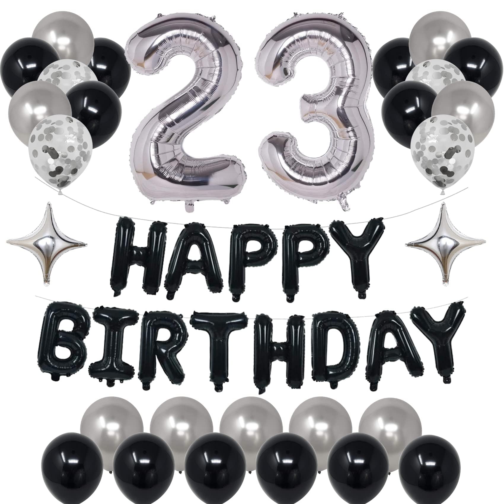 - Q: What items are included in the NANINUNENO 23rd Birthday Party Decorations kit? A: The NANINUNENO 23rd Birthday Party Decorations kit includes a 'HAPPY BIRTHDAY' banner, two number 23 foil balloons, two star foil balloons, twelve black latex balloons, ten silver latex balloons, and four silver confetti balloons.