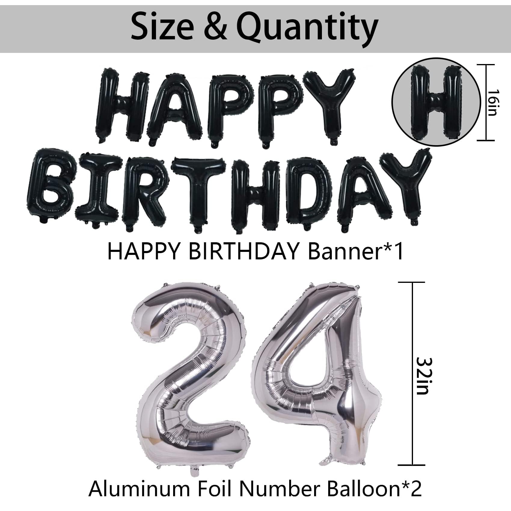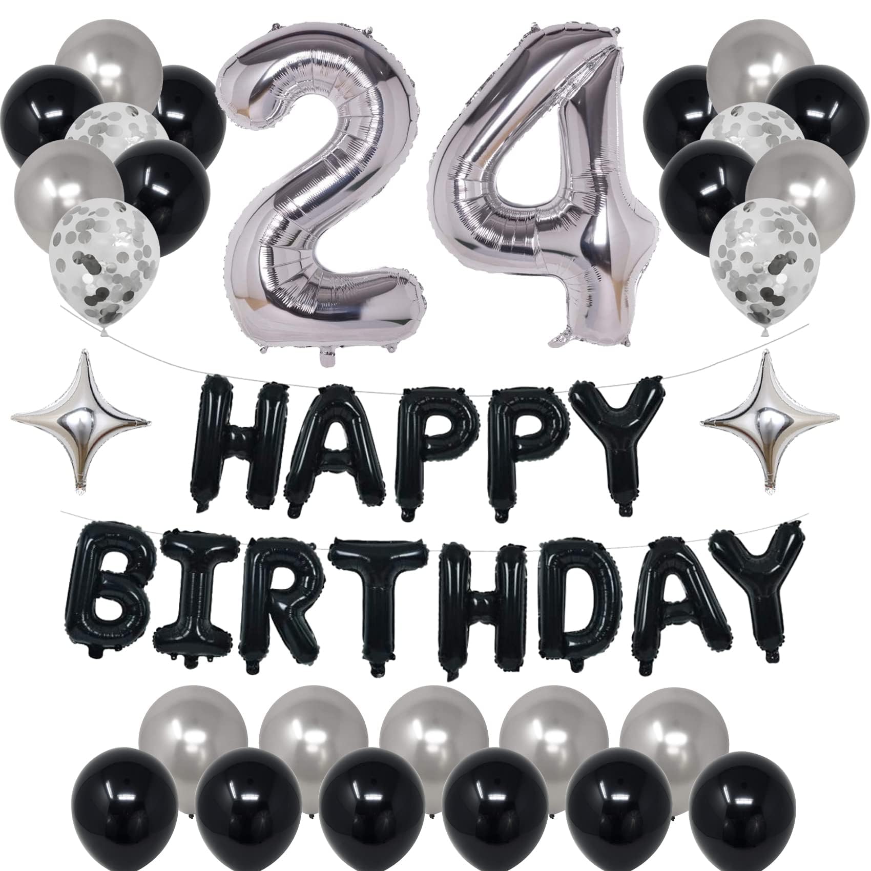 - Q: What does the NANINUNENO 24th birthday party decoration kit include? A: The NANINUNENO 24th birthday party decoration kit includes a 'HAPPY BIRTHDAY' banner, two number 24 foil balloons, two star foil balloons, twelve black latex balloons, ten silver latex balloons, and four silver confetti balloons. This comprehensive set meets all your decoration needs for a memorable celebration.