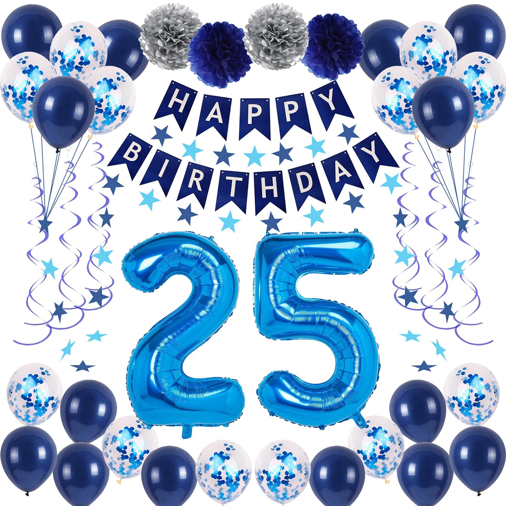 About The Blue Theme 25 Birthday Party Decorations Set Do You Wanna Embellish Your Birthday? Come On Lets Sing And Dance. We Sincerely Hope To Bring Wonderful Memories For Your 25 Years Old Birthday With Our Crafted Blue Theme Party Suit Package Includes: ? ''Happy Birthday'' Banner*1 Set ? 13 Feet Star Streamers Garland*1 Set(33 Stars) ? 28 Inches Hanging Swirls*1 Set(6 Streamers) ? 32 Inches Blue Number Foil Balloon*2 ? 6 Inches Silver Paper Flower*2 ? 6 Inches Blue Paper Flower*2 ? 12 Inches Navy Blue Latex Balloon*14 ? 12 Inches Blue Confetti Balloon*12 Warm Note: 1. Do Not Inflate These Balloons Too Full, 80% Is Fine 2. Latex Balloons Could Keep Inflated 2 Days When Filled With Air And 3-6 Hours With Helium 3. Please Inflate These Balloons 1-2 Days Before Your Party, Avoiding Excessive Sun Exposure.